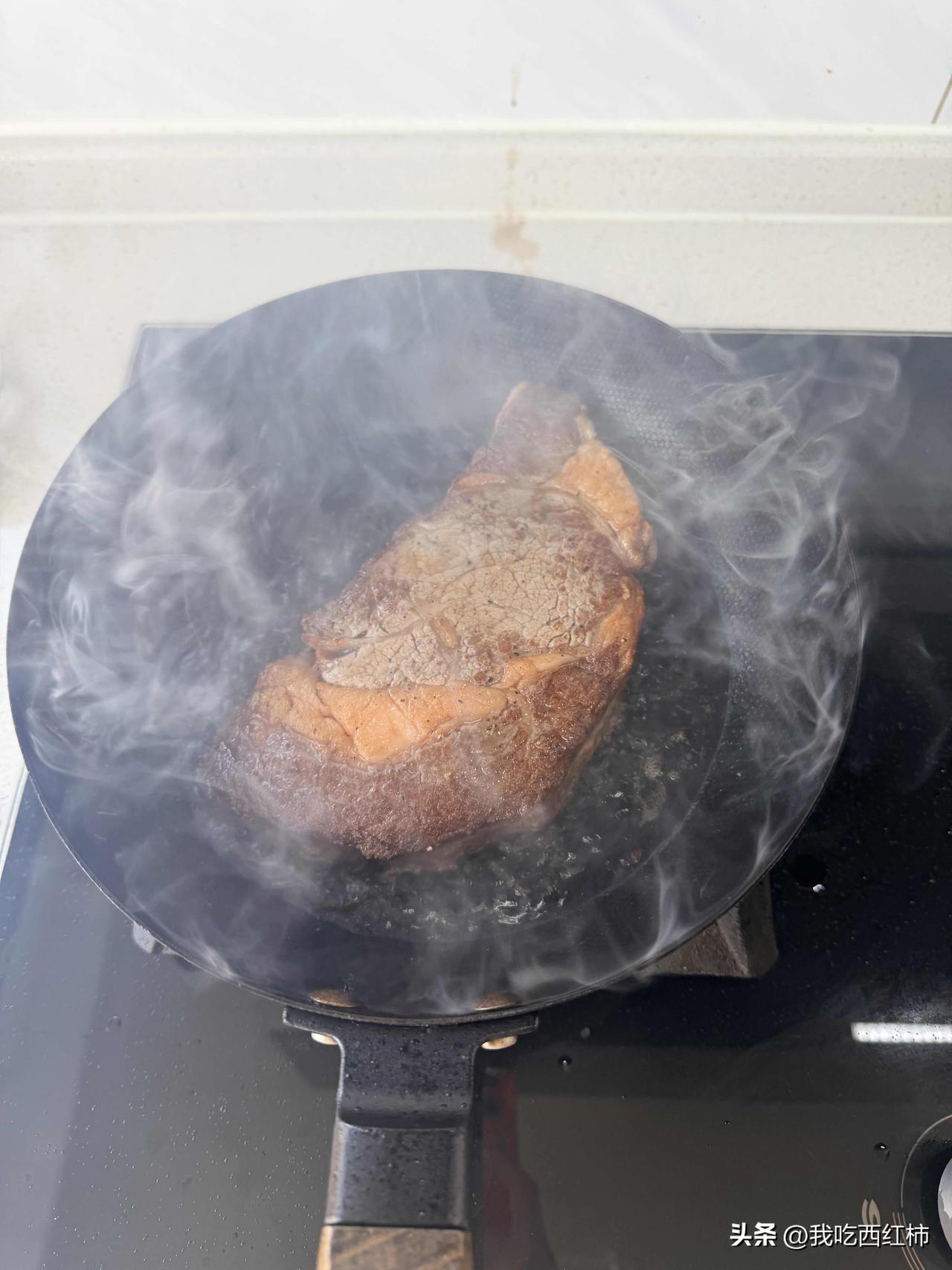 第一次煎牛排太吓人了👻 第一次煎牛排,查了一晚视频,本来信心满满,可是这个烟太大了,锅里还一直冒火,跟火烧牛排一样,整的手忙脚乱的,感觉整个屋子都是油烟,吃完赶紧洗个澡,还得敷个面膜!油烟真太大了,感觉要着火一样