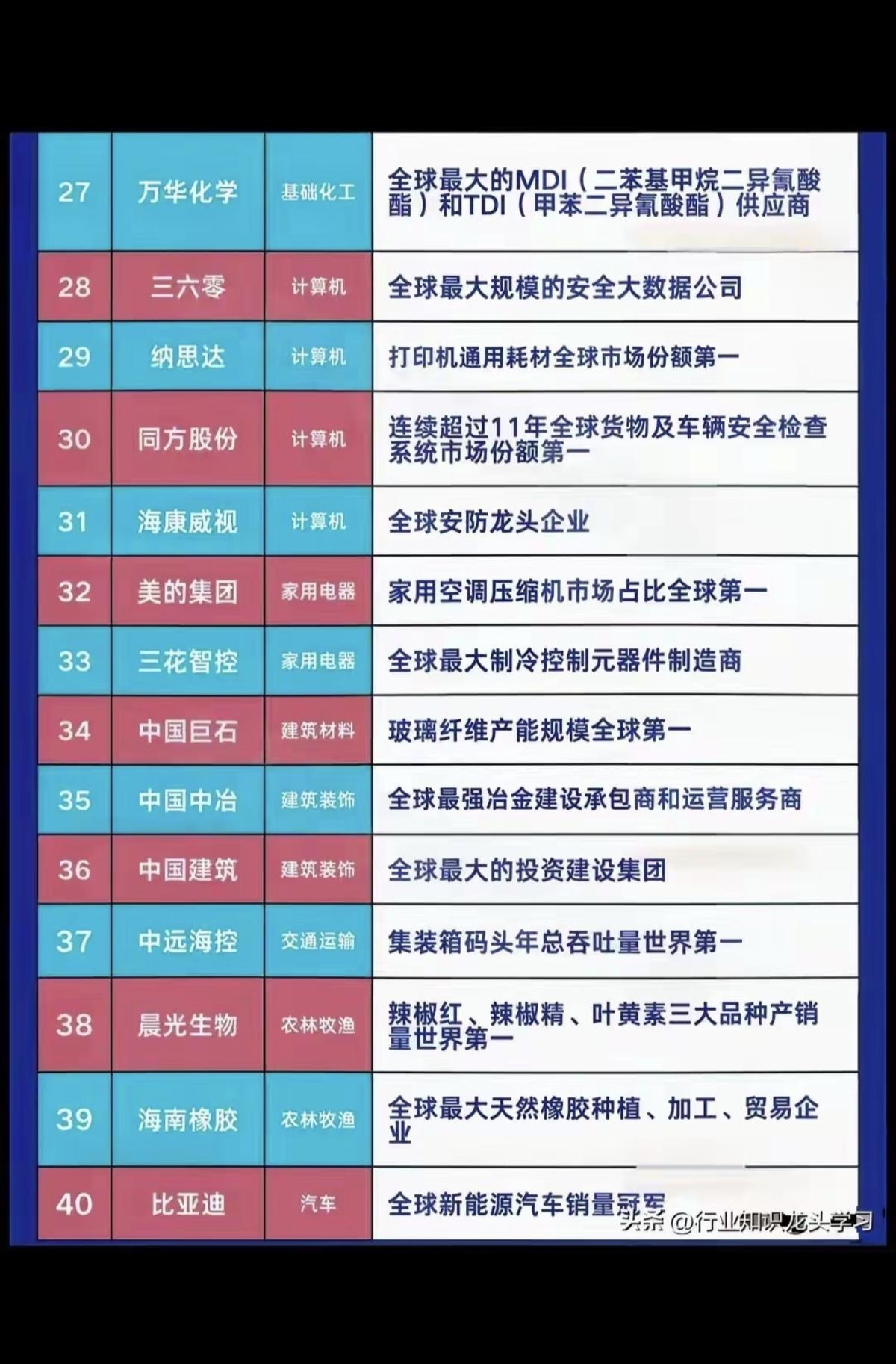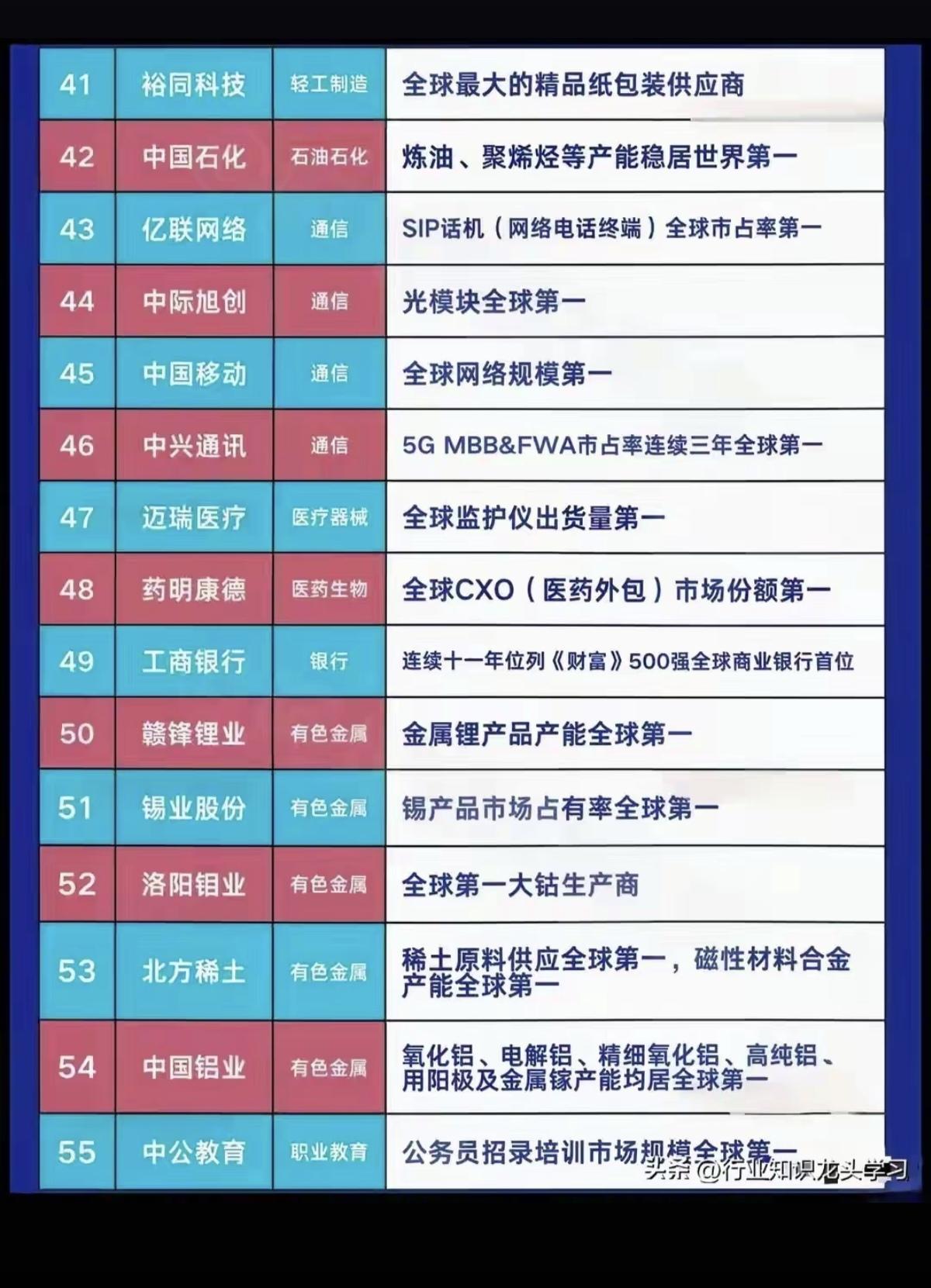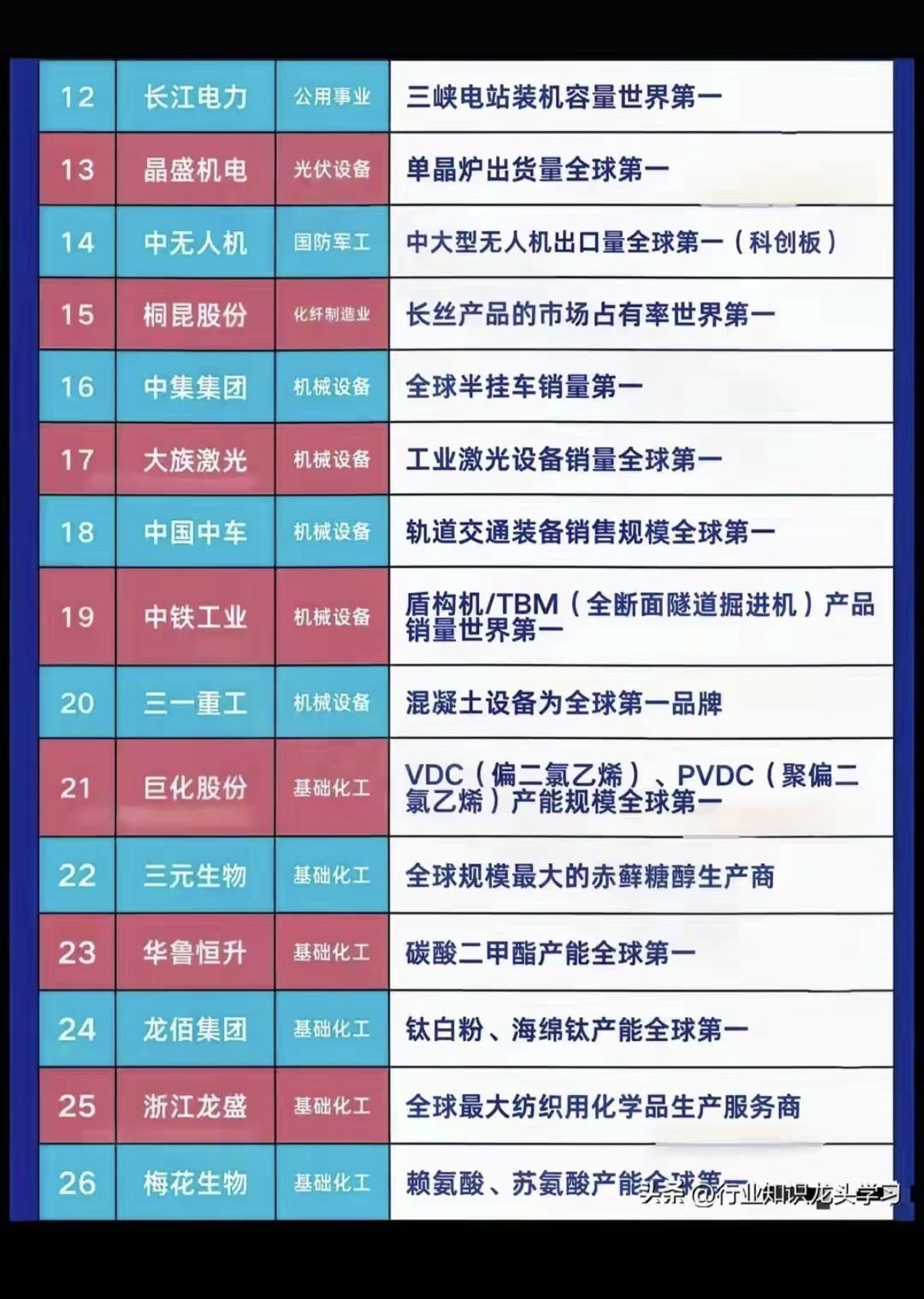 世界排名第一的:国内上市公司! 都是各个行业的绝对龙头! 具有垄断性,可以收藏