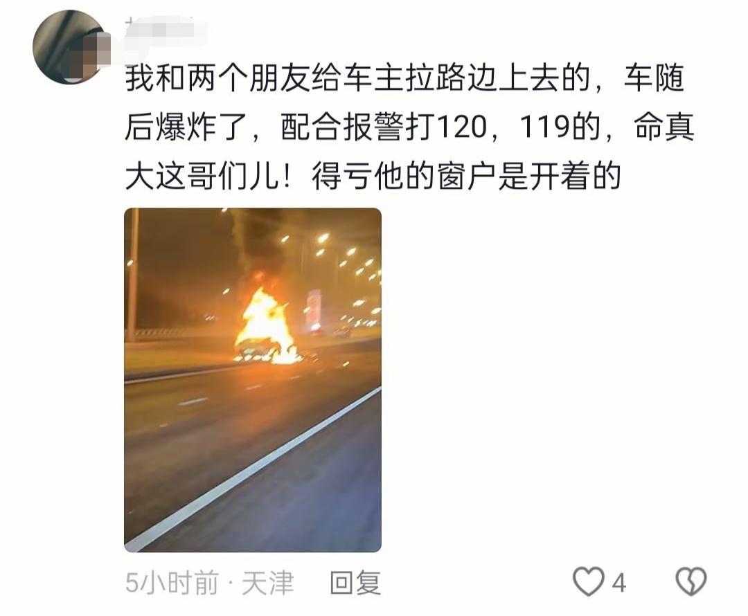3月23日,天津。网友发布视频,一辆新能源车疑似碰撞隔离带后起火,幸运的是车主没有大碍,路过的目击者及时将车主抬到了路边。具体情况以官方通报为准!