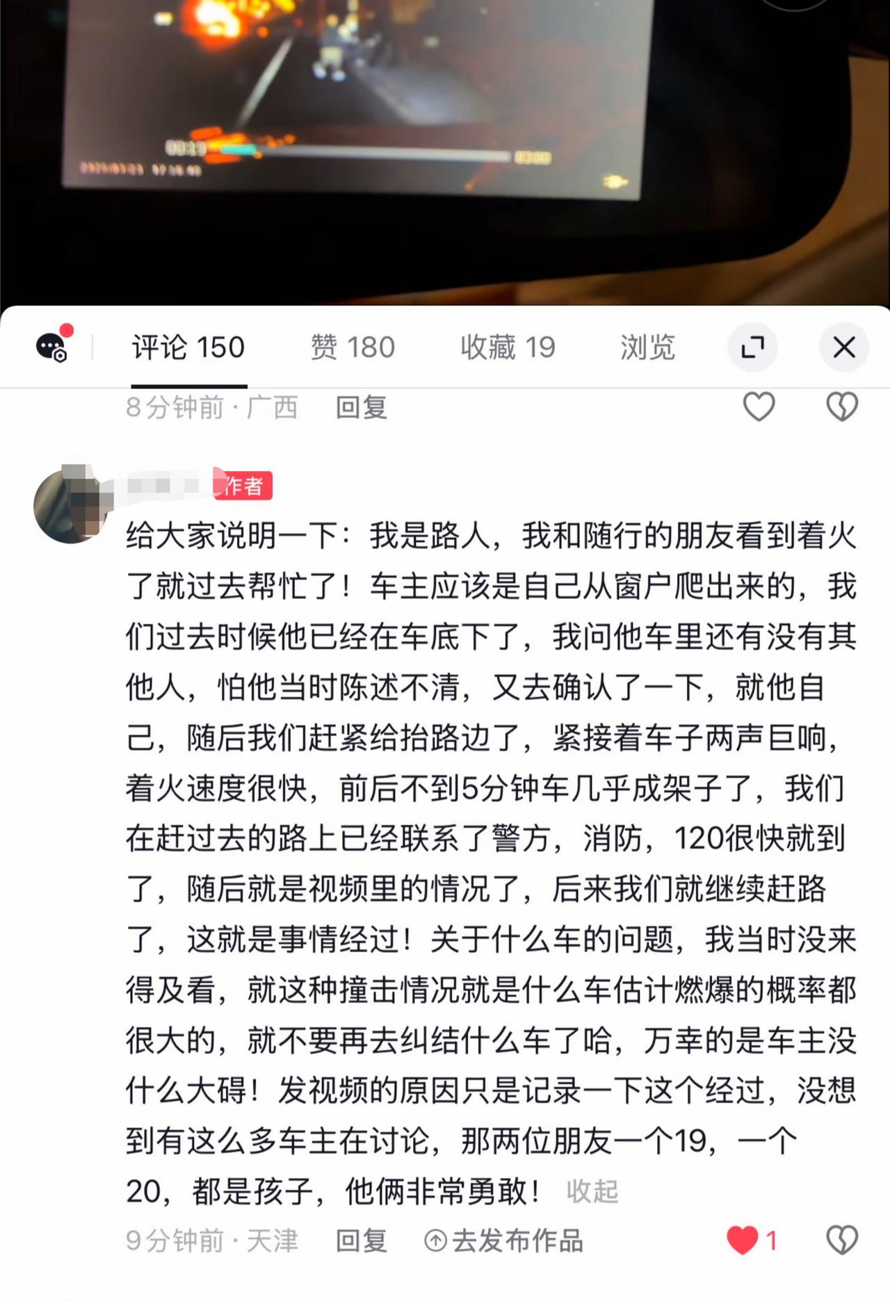 3月23日,天津。网友发布视频,一辆新能源车疑似碰撞隔离带后起火,幸运的是车主没