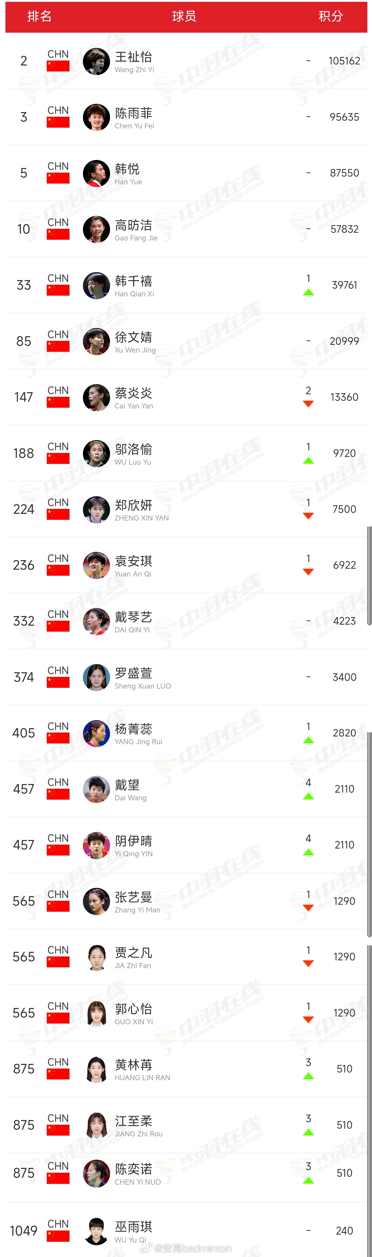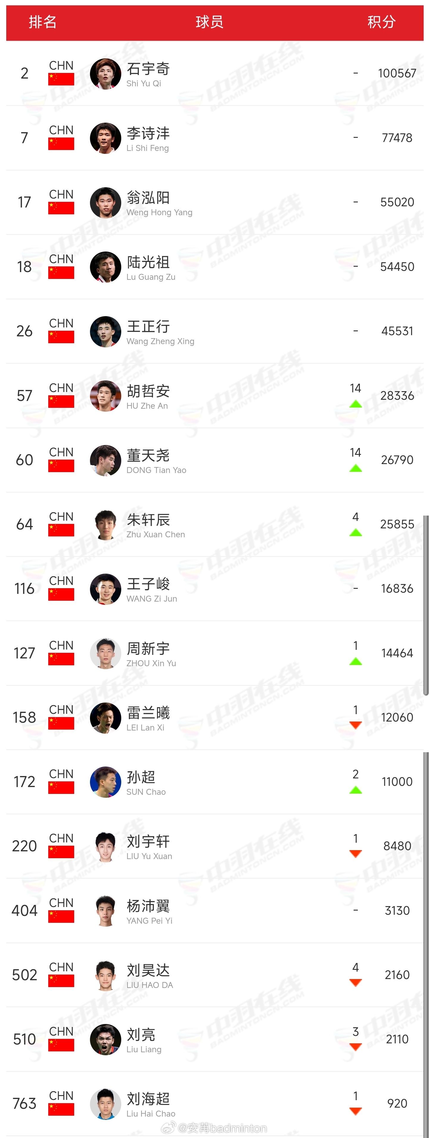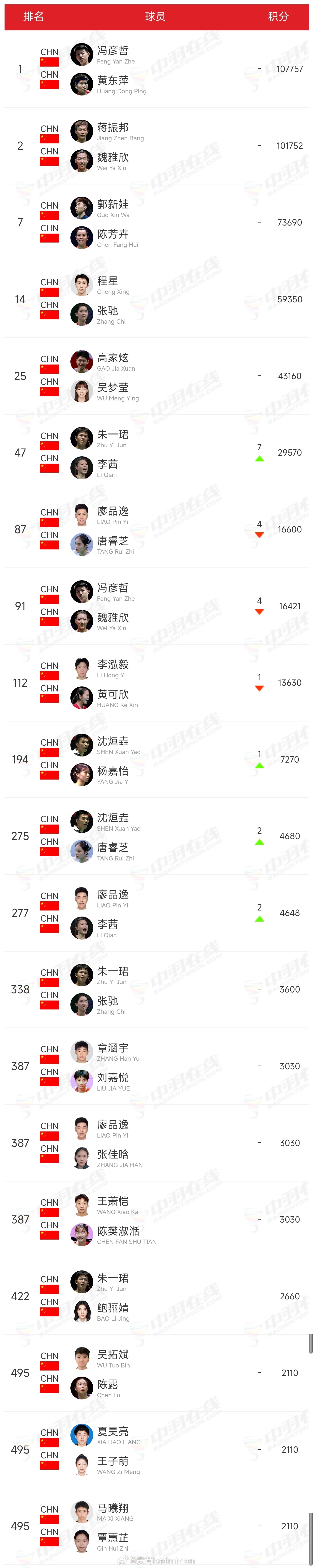 最新一期🇨🇳中国羽毛球队各单项世界排名