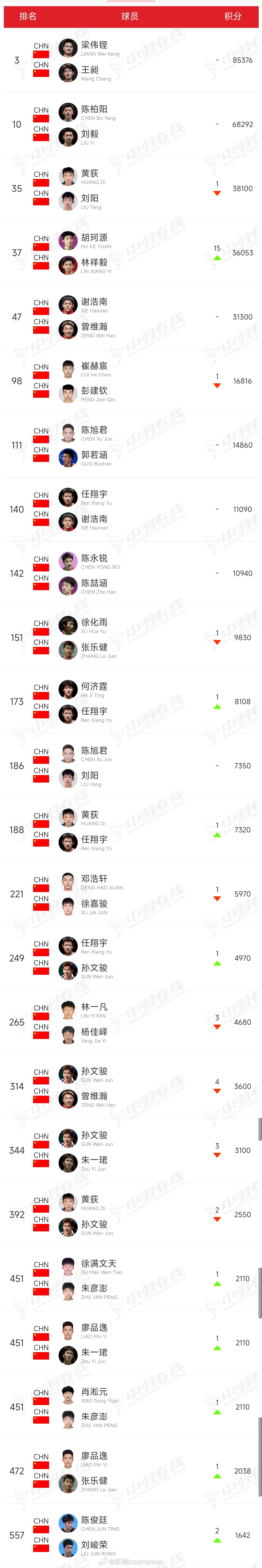 男双胡珂源/林祥毅上升15位,排在37。何济霆/任翔宇173。男单胡哲安上升1