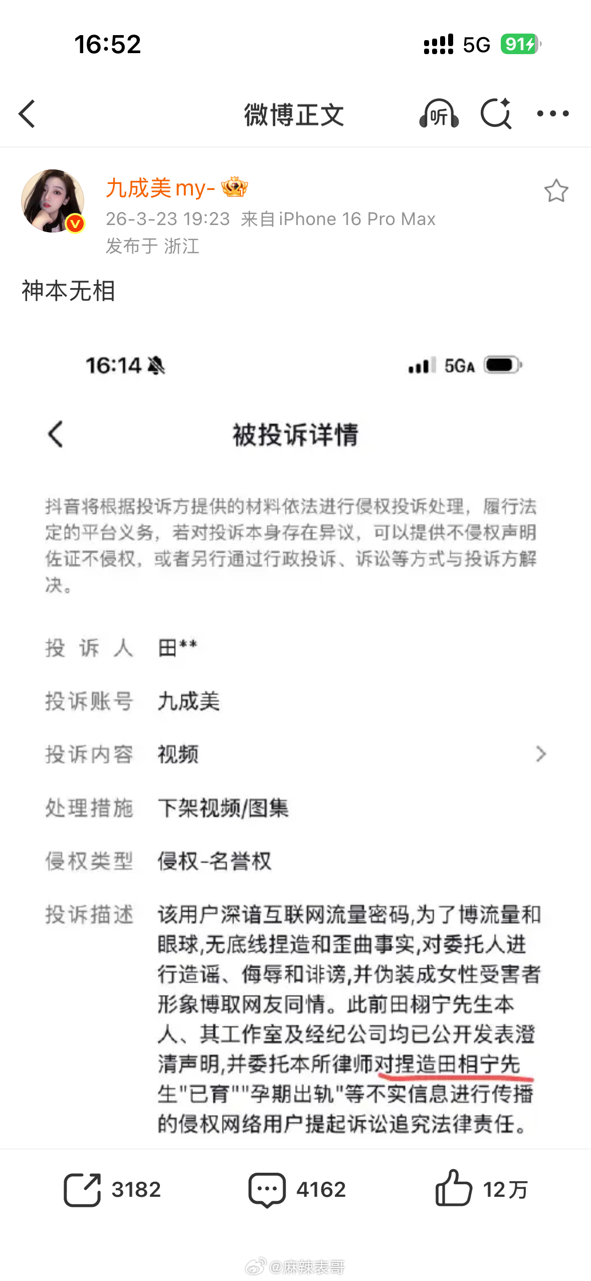 昨天九成美这边的视频被田栩宁投诉下架,写的是「田相宁」,然后九成美调侃,说“神本