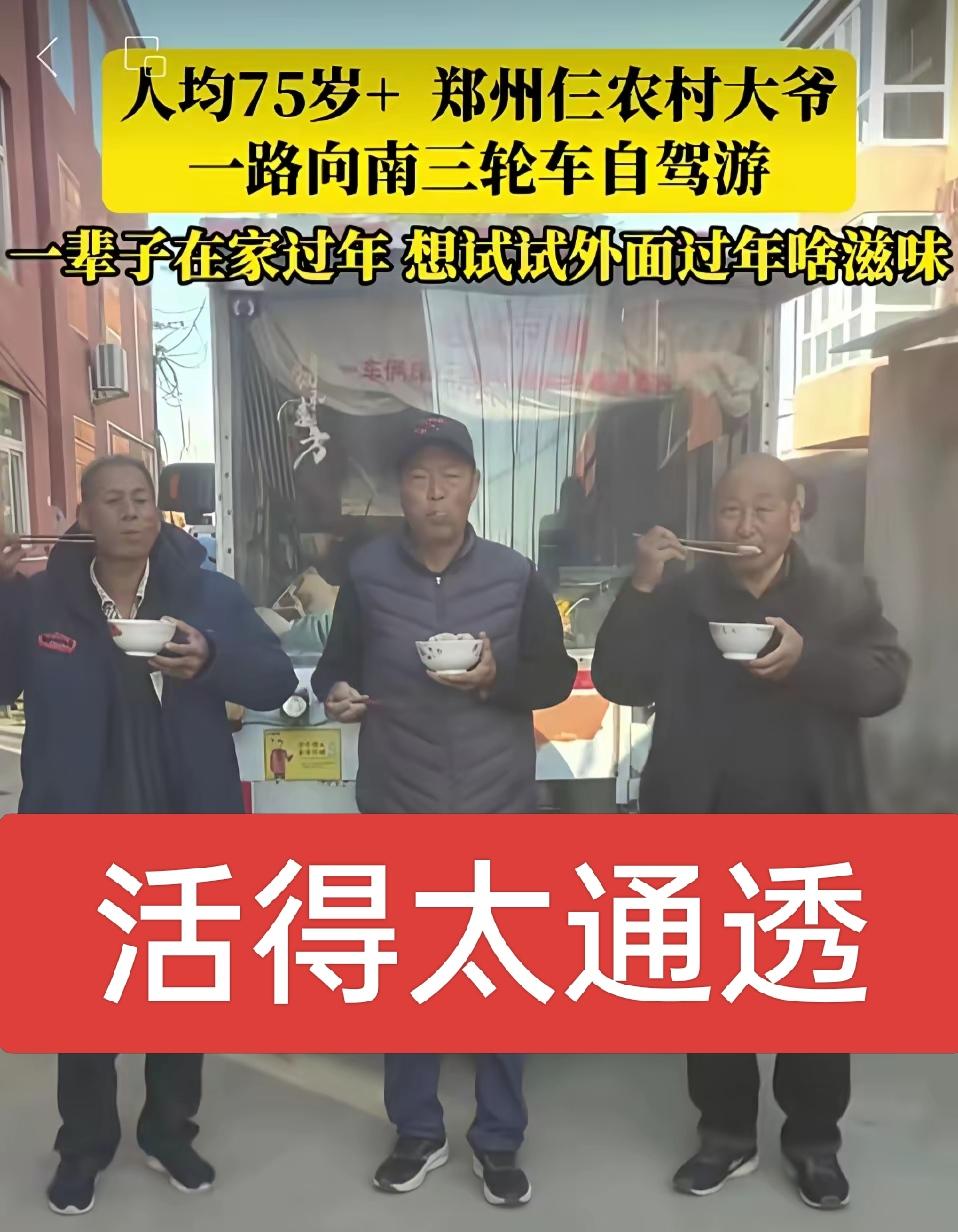这仨河南老头太酷了,开着三轮玩自驾游,他们是从小玩到老! 郑州中牟西杨村有三个老爷子,平均年纪75岁,开着一辆三轮车就去自驾游了。这趟旅程走了三个多月,总共才花了六千多块钱,他们全程自己动手丰衣足食,节省了不少开销,这也是一种独特的养老模式呀! 这才叫人生啊!有老友相伴,有说走就走的勇气,活得也太洒脱了,必须给这仨老爷子点个大大的赞!