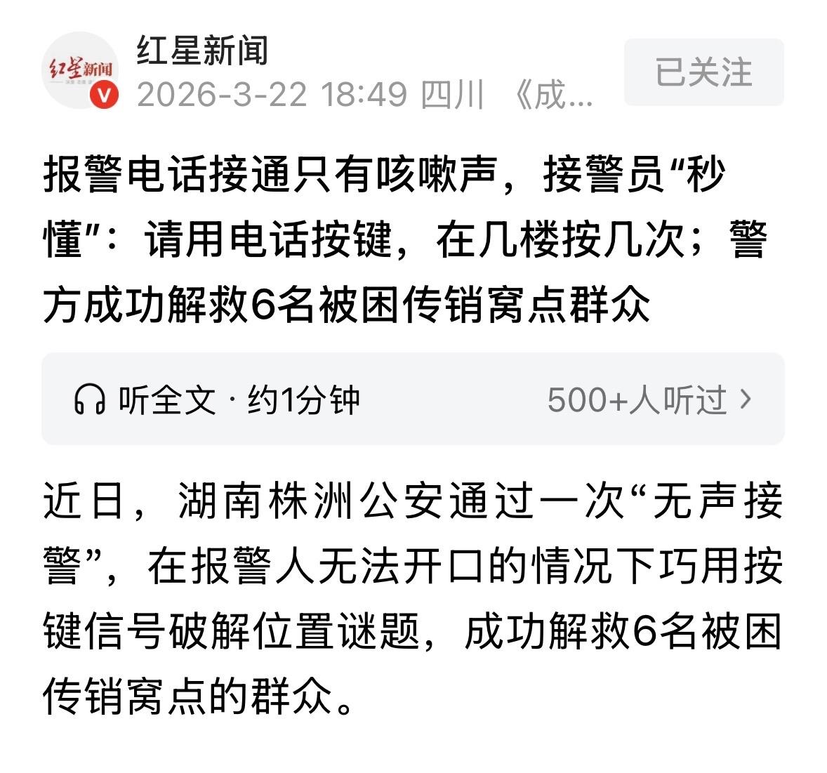湖南株洲,接警员接到一通电话,对方在电话那头一声不吭,只是不断压低声音咳嗽,接警员听后立马意识到不对劲,让对方用电话按键把具体位置告诉他,在几楼就按几次按键,得到位置后,警方迅速出动,没想到这一去,竟解救了6个人。 3月9日那天下午,南昌那边的110转过来一条紧急求助,说是有个手机号发了短信报警,内容很短,只说疑似被控制,情况危急,人可能在株洲。 指挥调度大队的接警员不敢怠慢,立马拨通了那个报警电话。 听筒里传来的不是呼救声,而是几声极力压抑的咳嗽,声音很轻,听得出来对方是在刻意憋着,生怕被旁边的人发现。 凭着多年的职业敏感,接警员知道,这人很有可能是被监视了,根本没法张嘴说话,稍微有点动静可能就要遭殃。 这时候常规的询问全失效了,必须得想个招。 接警员脑子转得飞快,既然不能听也不能说,那就用最原始的信号:电话按键音。 她在电话里压低声音快速交代:如果你在1栋楼,就按一下挂断键;2栋就按两下。楼层也是这个规矩,5楼按五下,10楼按十下。 为了怕对方听不清,这套暗语反复叮嘱了好几遍。 接下来的几分钟简直比过了一年还长。电话那头时不时传来“嘟、嘟”的挂断声,接警员一边掐着秒表数次数,一边把耳朵贴紧听筒,试图捕捉背景里的任何动静。 除了按键声,她还听到了远处隐约的摩托车喇叭声、甚至还有几声狗叫,这些细碎的环境音成了判断方位的关键拼图。 同时,她还得空出手指在键盘上飞快回短信,用文字双重确认刚才的按键对应的位置对不对。 就在这一来一回的“无声摩斯密码”中,被困者终于传回了准确坐标:某小区几栋几单元几楼。 位置一锁定,指令瞬间发到了贺嘉土派出所。 民警们早就在待命,一声令下,几辆警车闪着警灯呼啸而出,直奔目标小区。 冲进楼道、上楼、找门,动作行云流水。就在传销窝点的大门被踹开的一瞬间,屋里几个人还没反应过来,民警已经控制了全场。 屋里挤着6个人,个个面黄肌瘦,眼神里全是惊恐,显然是被洗脑加限制人身自由折腾得不轻。 经清点,正好是6名被困群众,全是被骗进来搞传销的。 这场教科书级别的解救,全靠接警员那几分钟的临场应变。要是按常规流程问地址,这通电话早就断了,人也找不着了。 现在这6个人已经安全脱险,后续的深挖和打击还在继续。 《人民警察法》第31条规定:人民警察遇到公民人身、财产安全受到侵犯或者处于其他危难情形,应当立即救助;对公民提出解决纠纷的要求,应当给予帮助;对公民的报警案件,应当及时查处。 6名群众身陷传销窝点,人身自由受限,属于典型的“人身安全受到侵犯”的危难情形。 接警员在报警人无法言语的极端条件下,没有机械接处警,而是创新运用“按键信号”和背景音分析锁定位置,体现了“应当立即救助”的法定职责要求。 对此,你怎么看? 关注@运良说法 学法律知识不迷路