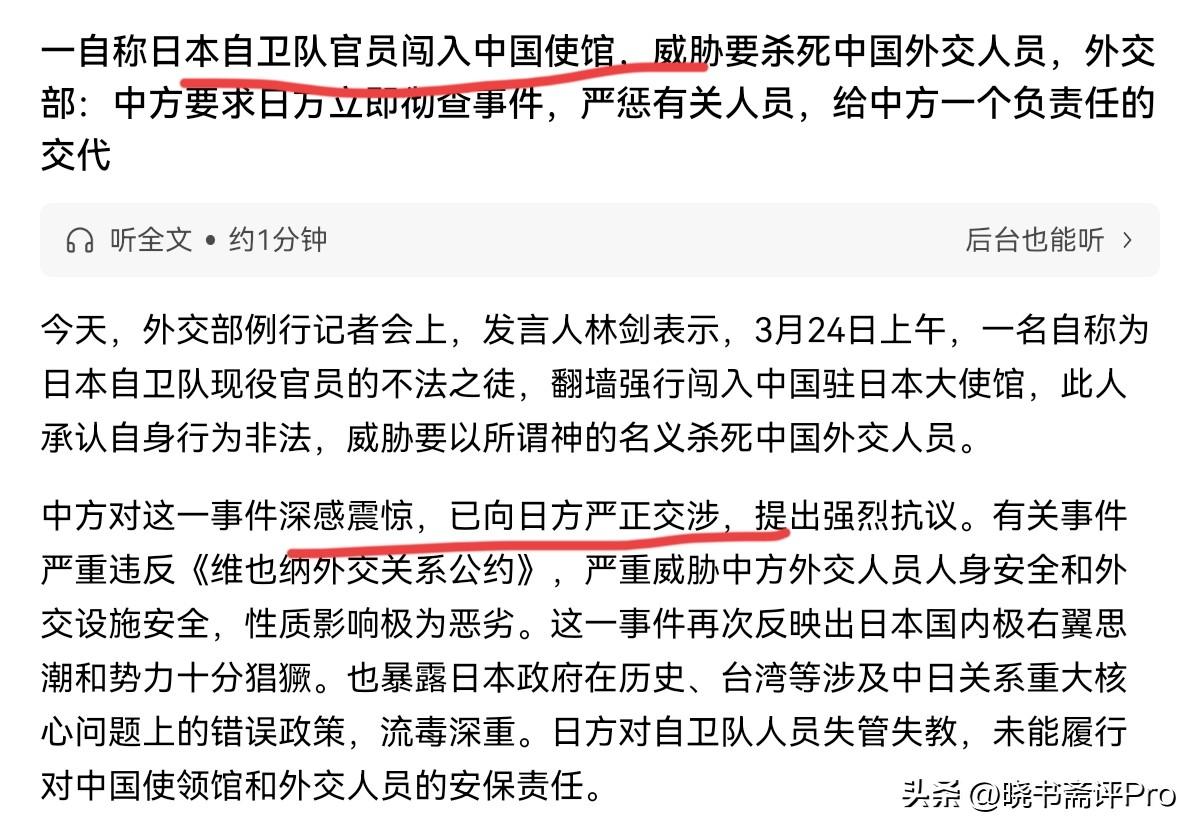 翻墙硬闯,扬言要杀死中国外交人员!中方表态,日本必须对此严惩!3月24日,根据国内媒体报道,3月24日上午,一名自称为日本自卫队现役官员的不法之徒,翻墙强行闯入中国驻日本大使馆,威胁要以所谓“神的名义”杀死中国外交人员。很显然,日本国内出现这样的针对我方外交人员的恶性事件,性质极为严重。 这样的事件看起来是个例,但是背后的原因可能更为复杂。为什么日本会出现这样的极端案例呢?这恐怕与日本国内仇华,反华气氛有密切的关系。假使日本国内整体对华友好,高市早苗政府不是一而再的散播中国“威胁论”,为其扩军主张制造舆论土壤,不是渲染对立情绪,将中国塑造成假想敌,日本极端分子又怎会不被煽动、铤而走险呢? 眼下中日关系非常紧张,高市早苗政府立场又极为顽固,这当然会引发一系列的对华极端事件的发生。更应该批评的是,中日关系不友好,作为所在国,日本理应为我方外交人员提供更加周密的安保措施,结果日本提供的安保措施竟然存在如此大的漏洞,这不能不说是日本政府的失职。 而硬闯的极端分子声称是日本自卫队成员,按理说,军人以服从命令为天职,纪律性应该非常之强。结果此人竟然如此胆大妄为,可见日本自卫队对于人员的管理存在重大的缺失。事件发生之后,我方已经表态,必须彻查,严惩,给我们一个满意的交代。日本政府必须严肃处理此事。