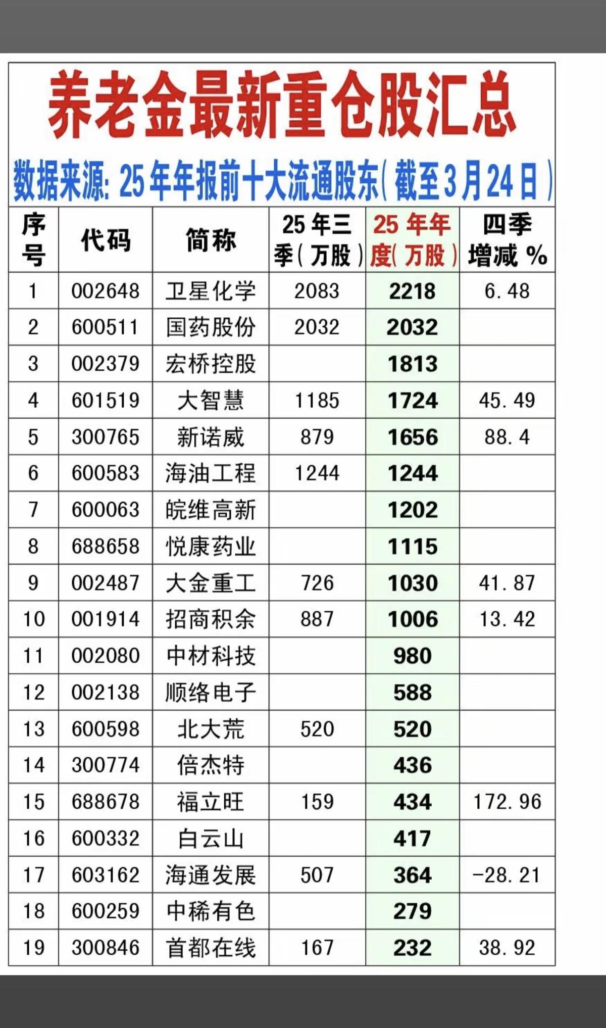 3.24周二 最新:某队重仓股名单! 1.汇金公司,重仓股9股 2.大基金,重仓股11股 3.证金公司,重仓股11股 4.企业年金,重仓股2股 5.养老金,重仓股19股 值得收藏备用。