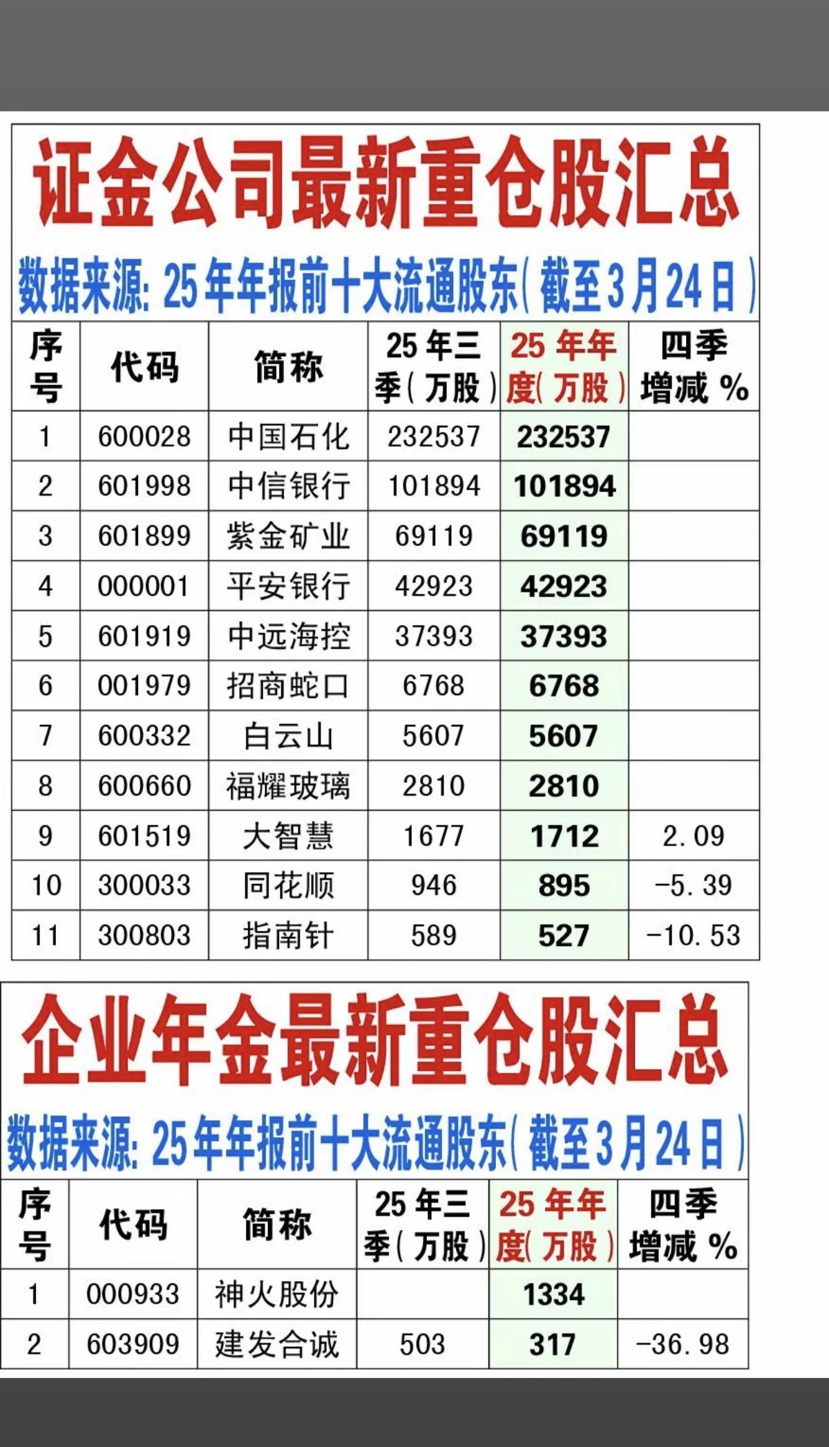 3.24周二 最新:某队重仓股名单! 1.汇金公司,重仓股9股 2.大基金,