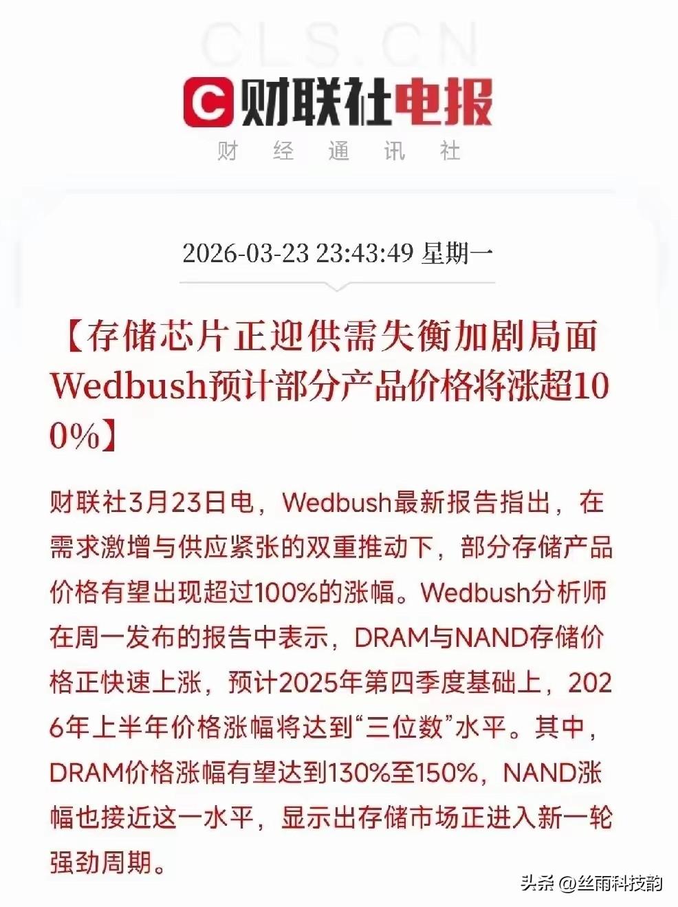 存储芯片价格要翻倍?别只盯着涨价,背后有个更值得关注的变化! 刚看到两条消息,有点意思: 一个是群联电子CEO说,现在客户要100颗芯片,他们只能给30颗,缺口高达七成,真补不上。另一个是机构预测,部分存储产品价格可能要翻倍,DRAM甚至可能涨130%—150%。 说实话,看到这俩数字的时候,我第一反应是——卧槽,这还让不让人活了? 130%到150%是什么概念?原来1000块钱的东西,转眼就变两千多了。要是你正准备换手机、攒电脑,这差价够吃好几顿火锅了。 但大家如果冷静下来一想,这件事要是只盯着“要涨价了”“赶紧买”看,那可就亏大了。我琢磨了一下,觉得这次涨价,跟以前真的不太一样。 以前咱也见过存储芯片涨价,几家巨头,一看市场需求不行了,就主动减产,把供应收一收,价格自然就上来了。等价格涨到位了,再慢慢放货。说白了就是——涨不涨、涨多少,主动权在人家手里,是他们“想涨”。 但这次真不一样。 你看群联那个数据,七成缺口啊!这可不是厂商捂着不卖,而是AI带动的需求实在太猛了。服务器要、手机要、PC也要,尤其是那些高端存储芯片,生产线满负荷在跑,还是跟不上。根本不是你想买就买得到。我有个在科技公司上班的学生前几天还在跟我吐槽,说他们公司想订一批高端存储芯片,结果供应商直接说“明年再说吧”,连排队的号都快拿不到了。这不是“不想卖”,这是真造不出来。 如果供给端短期扩不了产,需求端又被AI、智能设备持续推高,那这轮涨价周期,可能比以往更持久。 那这个变化意味着啥呢?我琢磨了三点,你听听有没有道理。 第一,你要是最近有换手机、换电脑的打算,尤其是想买大存储容量的,那真别拖了。 我不是说要恐慌性抢购啊,但我上周去数码城逛了一圈,有个老板直接跟我说,这周不买,下周可能就不是这个价了。我当时还觉得他是在吓唬我,现在看来,人家是真知道行情。这轮涨价不是那种“过两个月就回落”的短期波动。 第二,这轮行情里,不是所有厂商都能跟着吃肉。 以前行情好了,大家都跟着喝汤。但这次不一样,因为缺口主要集中在高端存储上。手里有技术、有产能的头部厂商,像三星、海力士这些,话语权越来越强。那些技术跟不上、产能不够的小厂呢?可能连订单都接不到。这就是典型的强者越强,弱者越弱。 第三,往长远了说,这轮缺芯其实在重塑行业的“话语权”。 以前是渠道为王,谁手里有货谁牛。但现在的情况是,上游厂商不仅控制了产能,还掌握了定价的绝对主动权。你客户再着急,我也只能给这么多。这种供需失衡要是持续下去,未来几年,存储芯片行业可能会从一个“周期性行业”,变得越来越像“寡头垄断行业”。到时候我们买东西,可能就没那么多性价比可挑了。 这样看来,对我们普通人来说,想换手机、电脑的,可能真得趁早下手了。而从投资角度看,这轮周期的核心不是“涨价”,而是“结构性的供需失衡”——有技术、有产能的头部厂商,话语权会越来越强。你们觉得呢?