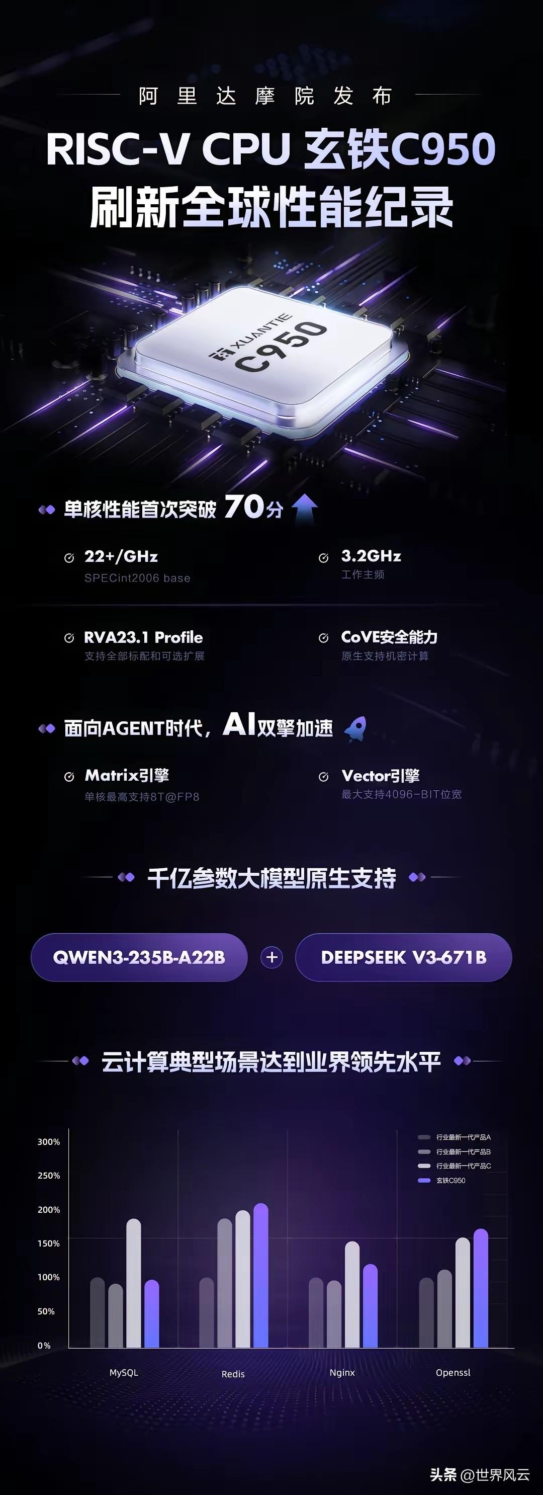 科技圈彻底炸了!中国开源架构CPU突然登顶,谁也没料到这一天来得这么快!中国工程院院士倪光南直接断言:国外双寡头长期垄断格局终结! 3月24日,上海,阿里达摩院在2026玄铁RISC-V生态大会上,扔出一枚真正意义上的“核弹”:新一代高性能处理器玄铁C950正式发布,直接刷新RISC-V性能天花板,成为全球最强RISC-V CPU! 数据一出,行业都沸腾了:Specint2006单核性能飙到22/GHz,主频3.2GHz,总分突破70大关。这是什么概念?直接对标Arm、X86最新一代的服务器CPU!这意味着RISC-V在性能上,已经堂堂正正与X86、Arm三足鼎立,真正挤进了全球主流芯片架构的牌桌。曾经被认为只能做“配角”的开源架构,如今直接坐上主桌! 而站在这一历史性突破最中央的,正是阿里的达摩院。 这不是天上掉下来的奇迹,而是七年磨一剑的硬核坚持。自2019年起,阿里就死磕RISC-V高性能路线。从C910让业界第一次知道RISC-V也能跑到2GHz,到去年C930迈过服务器芯片门槛,再到今天C950一骑绝尘——达摩院玄铁用三张王牌:极致性能的C950、全面均衡的C930、超高能效的C925,狠狠甩出了一条中国自主研发的崛起曲线。 别小看这组数据背后的分量。过去二十年,芯片架构的牌桌上只有两个玩家:一个躺着收税,一个坐着分账。开源架构?在不少人眼里,那是实验室的玩具,是边缘市场的代名词。如今C950一巴掌扇醒了所有质疑者,22/GHz的单核性能,3.2GHz的主频,这不是追赶,这是同场竞技。 有人会问,跑分归跑分,生态呢?这才是真正扎心的地方。RISC-V的优势恰恰在于它的开源属性,全世界开发者都能参与贡献,阿里这次直接把玄铁C950的软件栈全线开放,从编译器到操作系统,从数据库到AI框架,一整套工具链摆上台面。不是单点突破,而是系统性围剿。 倪光南院士那句话说得透彻,双寡头格局终结,不是喊口号,是实打实的性能对等加上生态崛起。X86有它几十年的江湖地位,Arm有它移动端的护城河,但RISC-V手里攥着的是全世界的想象力。一个没有授权费、没有黑盒子、谁都能改的架构,这在AI遍地开花、算力需求碎片化的时代,杀伤力是降维打击。 再看阿里这盘棋,下得够狠。七年时间,从C910到C950,达摩院干的不是简单的迭代,而是把RISC-V从“能用”一路推到“好用”,再推到“强到让人侧目”。C950面向的是数据中心、边缘计算、高性能计算这些曾经被X86牢牢锁死的领域。说白了,这是从底层开始,把根扎进最核心的算力市场。 国外那两家的反应也耐人寻味。一边是紧急调整授权策略,另一边是加速开源布局。动作够快,姿态够慌。因为他们比谁都清楚,一旦开源架构在性能上不落下风,商业模式的天花板就会被捅破。过去那种靠授权费躺着赚钱的日子,怕是真要翻篇了。 一个容易被忽略的细节是,这次发布的时间点选在3月24日,距离2024年RISC-V基金会首次来华开会恰好两年。短短两年时间,从技术追随到性能领跑,这种节奏感本身就说明问题——不是一时兴起,而是谋定后动。 性能参数背后,真正让人热血沸腾的,是话语权的转移。过去咱们谈芯片,绕不开的是“追赶”二字。如今C950把Specint2006总分推过70大关,这不是追赶,是直接并跑。未来三年,RISC-V在服务器市场的渗透率会从现在的个位数迅速攀升,这不是预测,是定局。 阿里达摩院这次亮出的不止是一颗芯片,更是一条清晰的路径。从C925的极致能效,到C930的全能均衡,再到C950的性能封顶,三款产品覆盖了从物联网到数据中心的全场景。什么叫体系化作战?这就叫体系化作战。不再是单点突破,而是矩阵式出击。 开源架构的魅力在于,它不属于任何一家公司,但每一家公司都能从中获益。玄铁C950的突破,真正撬动的是整个产业的杠杆。过去大家被X86和Arm的生态锁死,动弹不得。现在有了第三条路,而且是性能完全不虚的第三条路,整个产业链的议价能力和创新空间,都被重新打开了。 这场变局里,没有旁观者。从芯片设计公司到整机厂商,从开发者到最终用户,所有人都会在接下来的三到五年里,感受到这股开源架构的冲击波。C950不是终点,而是发令枪。当性能的短板被彻底补齐,剩下的,就是生态的加速奔跑。 各位读者你们怎么看?欢迎在评论区讨论。