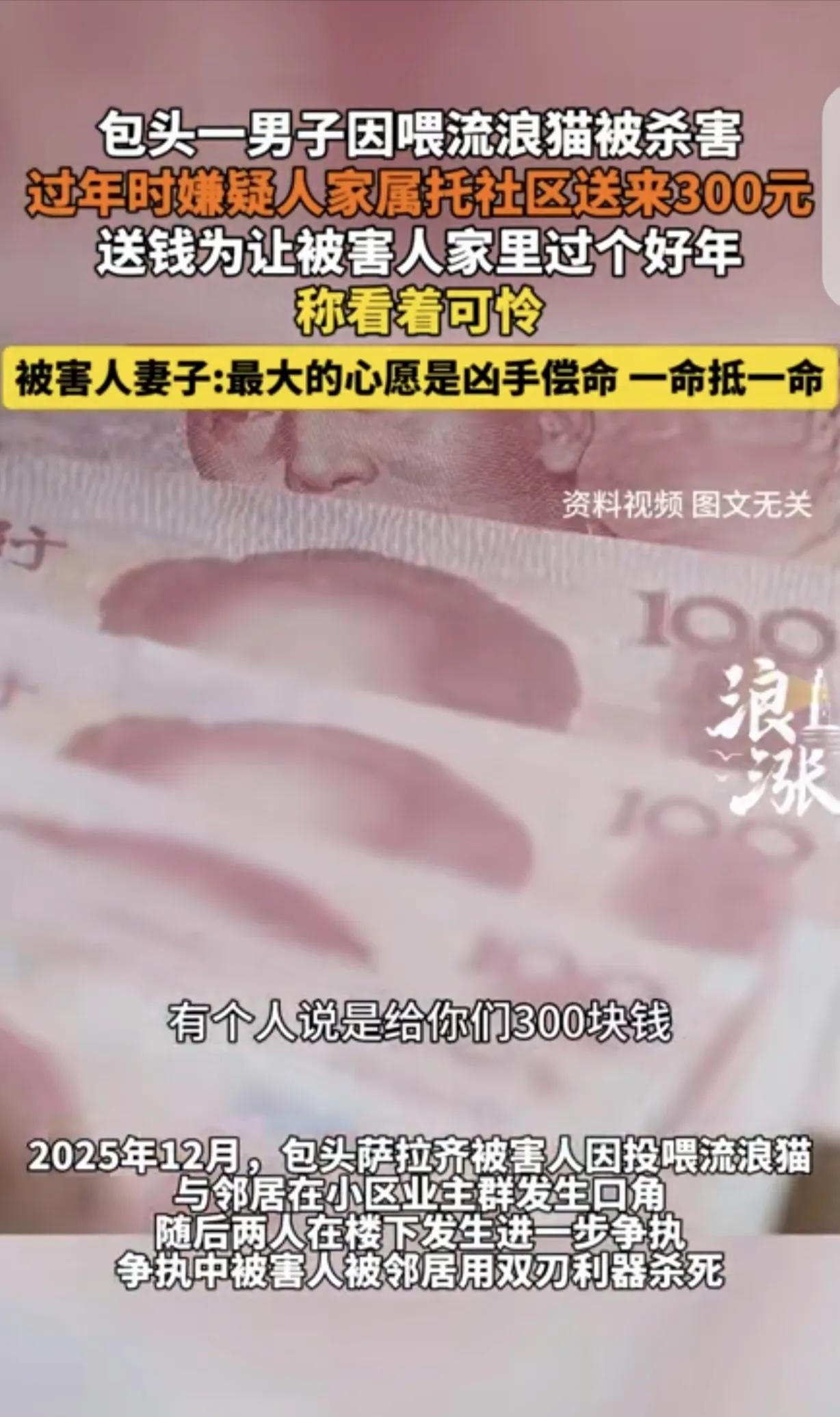 “严惩不贷!”内蒙古包头,男子喂流浪猫惹来杀身之祸,邻居在楼下将其刺死,腊月二十六凶手家属送来300元“过年钱”:看你可怜 俗话说,远亲不如近邻。可在内蒙古包头,一场因为流浪猫引发的争执,最后竟酿成了一条人命的惨剧。 事情发生在春节前,腊月二十六,本该是家家户户忙着准备过年的时候。可对于包头一位女子来说,这一天,她收到的不是年货,而是丈夫被刺身亡的噩耗。更让她心寒的是,社区工作人员随后送来了300块钱,说是行凶者家属给的,“看她可怜,让她过个好年”。 她当场拒绝了这笔钱,哭着说:“我丈夫没了,还过啥年?” 一、喂猫的善举,怎么就惹来了杀身之祸? 事情要从小区里的流浪猫说起。 男子是个心善的人,平时看见小区里的流浪猫饿得喵喵叫,经常随手带点吃的喂一下。在他看来,这就是举手之劳,也没碍着谁。 可同住一个小区的邻居不乐意了。这位邻居觉得流浪猫到处跑不卫生,还容易挠到人,早就对男子喂猫的事有意见。 俩人之前就在业主群里因为这事吵过好几回,每次都闹得不欢而散。谁也说服不了谁,心里的疙瘩越结越大。 事发那天,俩人在楼下碰上了。三言两语又扯到了喂流浪猫的事,说着说着火气就上来了,越吵越凶。 谁也没料到,那个邻居情绪彻底失控,竟然掏出随身携带的双刃利器,直接朝着男子刺了过去。 等周围人反应过来要拦的时候,男子已经倒在了血泊里,人当场就不行了。 二、一个家塌了,300块钱能补回来吗? 男子的妻子接到消息,哭到几次昏厥。家里的老人受了打击,一病不起。好好的一个家,就因为这点小事,塌了。 眼瞅着就到了腊月二十六,社区的人突然找上门,递过来300块钱,说是行凶者的家属托他们送的,觉得她不容易,让她拿这点钱买点年货好好过个年。 男子的妻子看着那300块钱,眼泪当场就掉下来了。丈夫好好的人说没就没了,这点钱怎么可能补得回一个大活人? 她直接拒绝了这笔钱,只盼着法律能给丈夫一个公道,让凶手付出应有的代价。 周围的邻居说起这事都唏嘘不已:本来是可以坐下来商量的小事,最后却闹成了两个家庭的悲剧,实在是太不值得了。 三、法律分析:这300块钱,不能替代法律的判决 从法律角度来说,这起案件的性质非常明确。 根据《中华人民共和国刑法》第二百三十二条规定,故意杀人的,处死刑、无期徒刑或者十年以上有期徒刑;情节较轻的,处三年以上十年以下有期徒刑。 本案中,行凶者因琐事与男子发生争吵,随后持双刃利器将对方刺死。主观上有杀人的故意,客观上实施了杀人行为并造成了死亡的严重后果,完全符合故意杀人罪的构成要件。 需要特别指出的是,刑法中的“故意杀人”并不要求凶手提前预谋,即使是在争吵过程中临时起意,只要实施了杀人行为,同样构成故意杀人罪。 行凶者家属送来的300元钱,在法律上属于“赔偿”的范畴,但显然远远不足以弥补给受害者家庭造成的伤害。更重要的是,这种赔偿不能替代刑事责任。按照法律规定,行凶者不仅要承担刑事责任,还要承担民事赔偿责任,包括丧葬费、死亡赔偿金、被扶养人生活费等。 另外,这起案件也反映出一个现实问题:很多小区里因为流浪动物引发的矛盾,本质上是因为缺乏统一的管理办法。如果小区能建立规范的管理制度,比如划定投喂区域、组织统一绝育等,类似的悲剧或许就能避免。 四、写在最后 一条人命,就因为几口猫粮没了。一个家庭,就因为一场争吵散了。 很多人看到这则新闻,第一反应是“不值”。可话说回来,什么样的矛盾值得用命来换? 那个喂猫的男子,他做错了吗?他只是心善,喂了几口吃的。那个动刀的邻居,他生气有道理吗?觉得流浪猫不卫生,可以找物业、可以找社区、可以协商解决。但他选择了最极端的方式。 冲动是魔鬼,这句话谁都会说,可真正碰到事的时候,能控制住自己情绪的又有几个? 现在行凶者已经被警方控制,案件还在走司法程序。等待他的,将是法律的严惩。可对那个失去丈夫的女人来说,再重的刑罚,也换不回一个完整的家了。 今日话题 小区里因为流浪猫狗引发的矛盾,你遇到过吗?你觉得应该怎么处理才合适?欢迎在评论区聊聊。 来源:综合自媒体报道及网络信息
