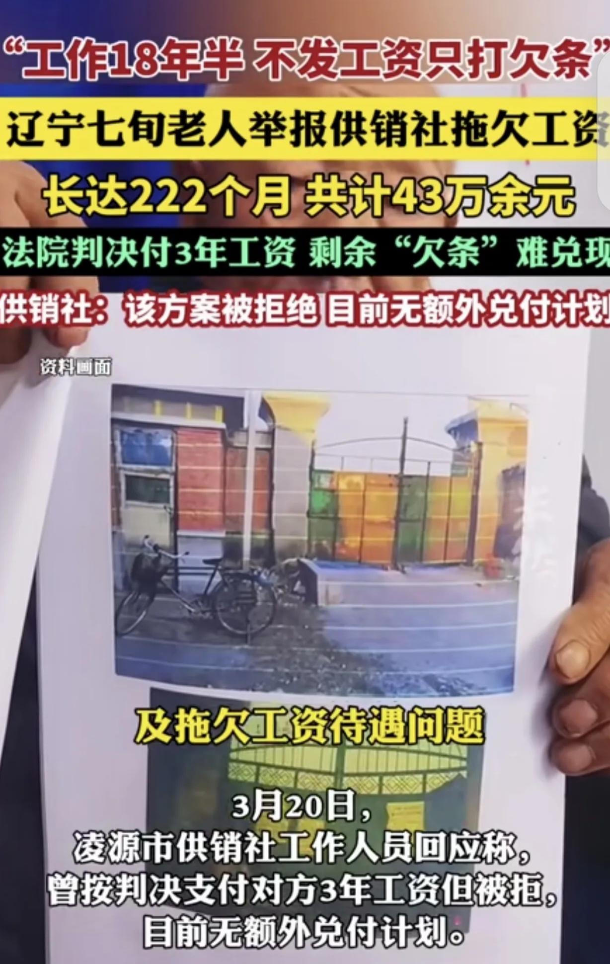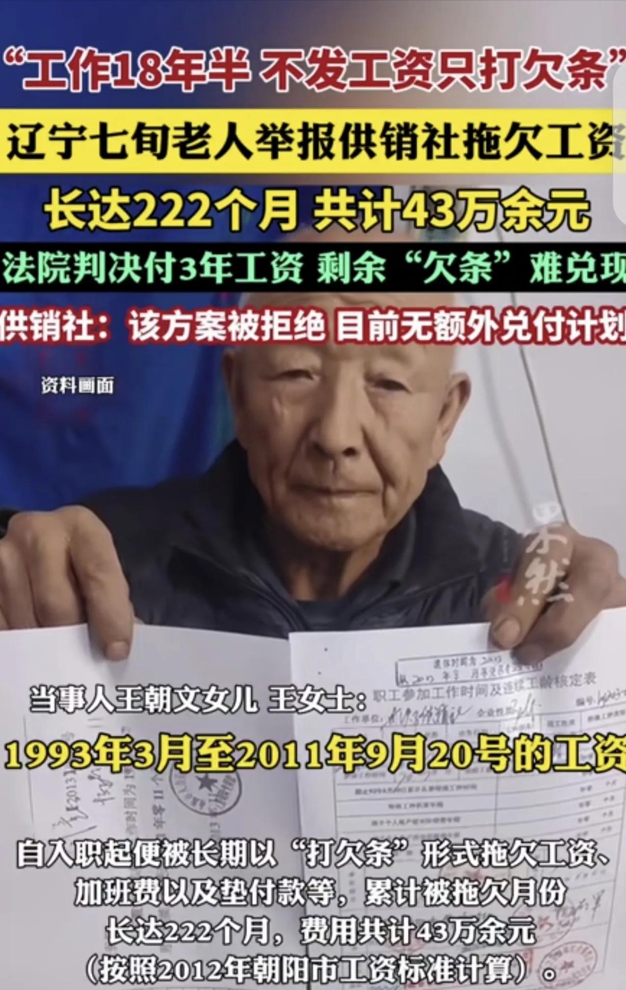 “这18年我白干了?”辽宁7旬大爷在供销社上班18年,工资被拖欠43万,法院判了3年工资,2026年供销社说给3万,大爷当场崩溃 你见过上班18年,一分钱工资没拿到,最后手里只剩下一摞欠条的吗? 辽宁一位7旬大爷,就摊上了这种事。他在当地供销社辛辛苦苦干了18年,222个月的工资,累计43万多元,全部被拖欠。他告上法庭,法院判供销社支付3年工资。2026年,供销社“挤牙膏”一样说给3万,大爷当场崩溃:“我半辈子白干了?” 一、起早贪黑18年,换来一摞欠条 事情要从1993年说起。那年,王大爷调入当地某供销合作社工作。在他看来,这是份“铁饭碗”,端上了就能安安稳稳干到退休。 他干得确实卖力,起早贪黑,从不迟到早退。他盘算着,靠这份收入养大孩子、给父母养老送终、帮儿女成家立业,然后自己和老伴安享晚年。 可他万万没想到,从入职那天起,供销社发工资就不给现钱,而是打欠条。不仅工资,加班费和他平时为工作垫付的款项,也统统被拖欠。 上班挣钱是为了养家糊口,可王大爷辛苦一个月,非但拿不到钱,还得往里搭钱。他也搭不起啊,可不干又不行,只能硬着头皮继续干。 这一拖,就是18年。到2010年他决定打官司的时候,被拖欠的工资累计222个月,金额高达43万多元。 王大爷多次找到供销社负责人,苦苦哀求结清工资,得到的答复永远是“再等等,资金紧张,有钱了一定给”。他信了,一等就是好多年。 眼看着自己年纪越来越大,身体一天不如一天,工资却一分没拿到,王大爷心急如焚。 二、打了官司,法院只判了3年工资 2010年,多次讨薪无果后,王大爷把供销社告上了法庭。 官司打了几年,2013年二审判决下来了。法院认定王大爷和供销社之间存在劳动关系,但因为供销社改制、待业协议等原因,劳动关系中间断了。加上王大爷有些诉求超过了诉讼时效,法院最终只判决供销社支付他3年的工资。 王大爷对这个结果坚决不服。他觉得自己的辛苦钱不该就这么打水漂,于是四处奔走反映情况。 2018年,经过协调,终于确认了王大爷在供销社的工作时长为18.5年,并且约定要核算他的欠薪情况。可这个约定,始终没能执行下去。 三、2026年,供销社说给3万,大爷崩溃了 时间来到2026年,供销社终于提出了一个“解决方案”:愿意给王大爷3万多元。 3万多元,和王大爷被拖欠的43万相比,差了十万八千里。如果接受了,就等于承认自己这么多年白干了。王大爷一口回绝。 可供销社的回应更让人寒心:法院判决支付3年工资,但王大爷不同意,那就没办法了。 这话听着是不是特别讽刺?法院判的是3年工资,可供销社连这3年的钱都没给,反倒用“判决”当挡箭牌,把责任推到了王大爷身上。 70多岁的王大爷,为这笔工资耗了半辈子,到头来还是一摞欠条。这件事看得人心里堵得慌,辛辛苦苦干了快19年,最后连个说法都没有,搁谁身上能不崩溃? 四、法律分析:欠薪不是“没办法”,是有人不想办 很多人看到这里会问:法院都判了,为什么还执行不了? 这里面涉及几个法律问题。首先,2013年的判决只支持了3年工资,原因是诉讼时效问题。根据《劳动争议调解仲裁法》第二十七条,劳动争议申请仲裁的时效期间为一年,从当事人知道或者应当知道其权利被侵害之日起计算。王大爷被拖欠了18年工资,但他没有每年都去主张权利,导致部分诉求超过了时效。 但这不代表供销社就可以“理直气壮”地不给钱。根据《保障农民工工资支付条例》第二十九条,建设单位应当按照合同约定及时拨付工程款,并将人工费用及时足额拨付至农民工工资专用账户。虽然王大爷是供销社职工,但欠薪的性质是一样的,当地部门应当介入核查欠薪事实,督促供销社制定合理的兑付方案,不能以“时效”“协议未落地”为借口逃避责任。 更关键的是,2018年的协调已经确认了王大爷18.5年的工龄,并约定核算欠薪情况。这个约定虽然不直接等于法院判决,但反映了供销社对欠薪事实的承认。如果供销社出尔反尔,王大爷完全可以根据这份协调结果再次主张权利。 另外,如果王大爷对2013年的判决不服,其实可以在法定时效内申请再审。现在虽然时间过去很久了,但如果能证明供销社一直承诺“有钱就给”,导致他未能及时主张权利,诉讼时效中断的情形也是存在的。 五、写在最后 王大爷今年已经70多了,为这笔工资耗了半辈子。他想要的,不是施舍,不是“可怜”,而是自己用18年血汗换来的43万辛苦钱。 可现实是,法院判了3年工资,供销社只肯给3万,还摆出一副“你不同意我也没办法”的姿态。这明摆着是欺负老实人。王大爷已经等不起了,别让老人到最后既亏了钱又寒了心。 你身边有没有遇到过类似的欠薪问题?你觉得王大爷这笔钱还能要回来吗?欢迎在评论区聊聊。 来源:综合自媒体报道及公开信息