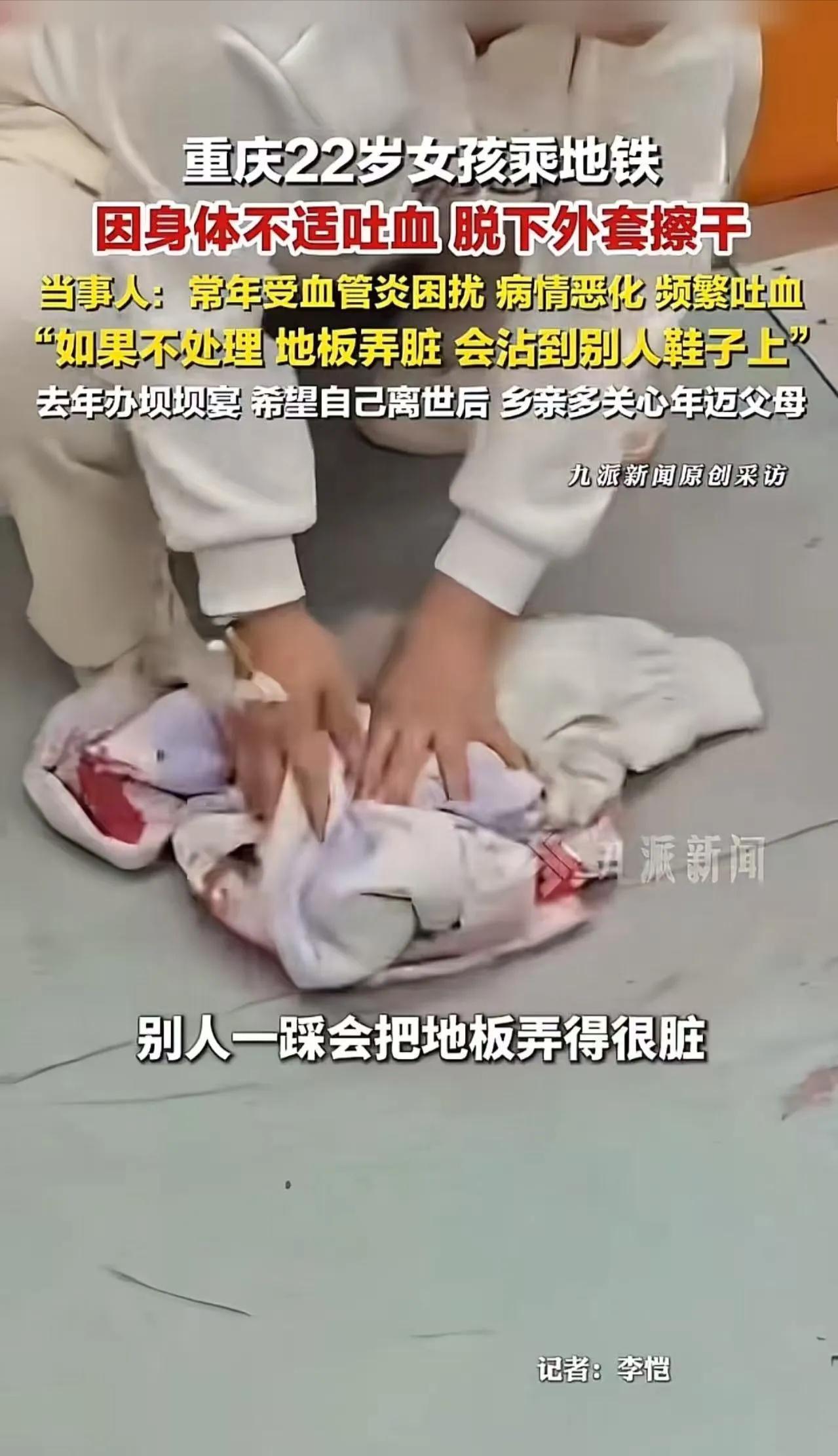 “多么善良的姑娘啊!”重庆22岁女孩地铁吐血,脱下外套把地擦干:我怕弄脏别人鞋子 2026年3月23日,重庆地铁1号线上,发生了一幕让无数人泪目的场景。 一个脸色苍白的女孩,突然“哇”地一口鲜血吐在了车厢地板上。血迹刺眼,周围乘客都吓了一跳。 可接下来的一幕,让所有人都沉默了——她二话没说,直接脱下自己身上的外套,蹲在地上,一点一点地把血擦干净。擦完之后,她虚弱地靠在旁边休息了一会儿,好像连喘气都很费力。 一、她叫胡心瑶,今年才22岁 这位女孩叫胡心瑶,2003年出生在重庆垫江县,是个00后。 事后有记者联系到她,她说了句让人心碎的话:“最近经常这样,一天吐两三回。当时是在去医院的路上,突然吐血了。因为场面有点血腥,担心大家被吓到,也怕弄脏别人鞋子,所以赶紧用外套擦了。” 她擦掉的不只是地上的血,更是人心里的冷漠。她弄脏的是自己的衣角,擦亮的却是整座城市的温度。 二、这不是“懂事”,是她已经习惯了跟死神打交道 可谁又知道,这个蹲在地上擦血的姑娘,背后藏着怎样的绝望? 胡心瑶得的是一种叫ANCA相关性血管炎的罕见病。医生说,这种病会攻击全身血管,如果没有及时治疗,一年内的死亡率曾经高达80%。她已经和这个病纠缠了整整八年。 2021年开始,她就频繁收到病危通知书。3月23日那天,就在地铁上吐血之后,她又自己签收了一张——父母都在老家,没人帮她签,只能自己来。 今年以来,她收到的病危通知已经有十几张。光是2025年一年,就有28份。 因为家里穷,住不起院,她只能每天去急诊科做最简单的应急处理。别人休息的时候她在加班,别人聚餐的时候她在医院复查。 去年12月,她甚至去嘉陵江边拍了“遗照”。摄影师看出她情绪不对,偷偷报了警。警察听完她的故事,当场捐给她1300块钱。她说那是她人生中收到的第一笔捐款,“陌生人的善意,让我看到了一丝丝希望。” 她的前男友曾多次求婚,她含泪拒绝了,怕拖累人家。后来那个男孩因病去世,走之前还托朋友把攒下的5万块钱转给了她,希望她能实现成立“病友之家”的愿望。她用这笔钱真的建了个“鹿灵瑶病友之家”,和病友们互相帮助。 三、法律视角:这样的善良,值得被制度接住 胡心瑶在地铁上擦血的行为,从法律角度看,其实是一种“利他行为”。虽然没有明确的见义勇为认定标准,但这种在极端困境下仍为他人着想的品质,恰恰是社会需要保护的东西。 更重要的是,她的遭遇暴露了罕见病患者面临的现实困境。根据我国医保政策,系统性血管炎已被纳入门诊慢特病管理范围。这意味着患者可以申请门诊慢特病认定,享受相应的医保报销待遇。 此外,像胡心瑶这样因重大疾病导致生活困难的情况,还可以申请临时救助。根据《社会救助暂行办法》和重庆市的政策,因家庭成员突发重大疾病、医疗费用负担过重的家庭,可以申请临时救助,符合条件的话可以获得一定的救助金。 具体到胡心瑶的情况,她属于“因患重特大慢性疾病需要长期维持院外治疗”的情形,按照规定可以申请相应的医疗救助。如果她属于低保对象或特困人员,还能享受大病保险起付标准降低、报销比例提高等政策。 好在,视频引发关注后,事情有了转机。爱心人士的捐款让她在3月24日凌晨转入了四川大学华西医院,正在抢救区排队等待治疗。重庆市红十字会也表示,正在联系医院了解情况,会尽可能为她提供帮助。 四、写在最后 胡欣瑶在生命垂危之际,第一反应不是求救,而是怕弄脏别人的鞋。这种“过度懂事”,让人心疼到窒息。 很多网友说:“看她蹲在那用衣服擦血的那一刻,我的眼泪直接下来了。这是什么神仙姑娘啊!自己都在鬼门关徘徊,心里想的却是别人的鞋子干不干净。” 可我们也要想一个问题:为什么一个病得这么重的姑娘,要自己一个人坐地铁去医院?为什么她收到病危通知书,只能自己签?为什么她需要靠网友的捐款,才能转去更好的医院? 社会的温度,不取决于富人的施舍,而取决于我们对最底层、最苦难者的态度。我们需要更完善的救助机制,让每一个“懂事”的人,在倒下的时候,有一双强有力的手能稳稳接住他们。 今日话题 你身边有没有像胡心瑶这样“太懂事”的人?你觉得我们的社会救助体系还能在哪些方面做得更好?欢迎在评论区聊聊。