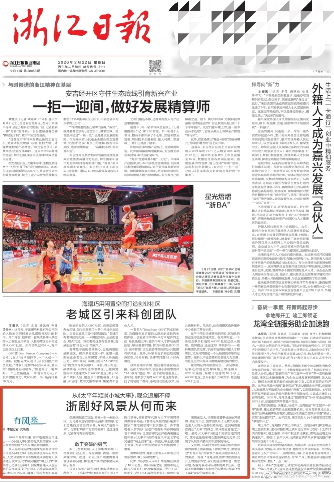 《浙江日报》头版——《小城大事》观众追剧不停!浙剧好风景,《小城大事》好风光!小