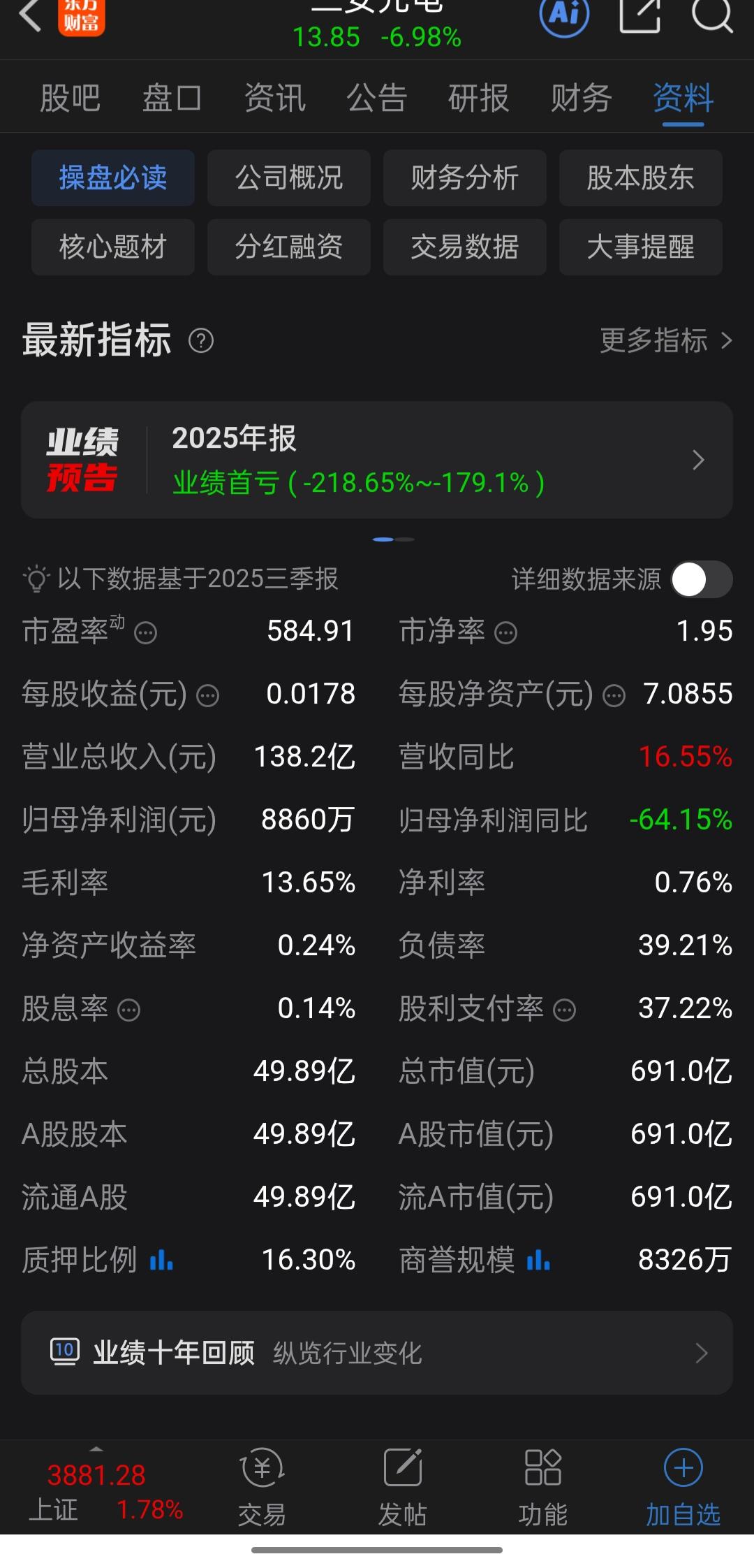 昨天这家国内LED芯片龙头开盘直接“一字跌停”,股价牢牢封死在14.89元/股的跌停板上,全天成交额急剧萎缩,直到收盘都纹丝不动,总市值跌至742.86亿元。而今天恐慌情绪继续蔓延,截至收盘,公司股价报收于13.85元,再度大跌6.98%,成交量急剧放大至64亿元,其中主力资金净流出高达8.41亿元。 短短两个交易日,股价从15元附近直接砸穿14元关口,让持有的股民们直呼“心碎”。 这一轮暴跌的直接导火索,源于一则炸雷般的公告。3月22日晚间,公司发布公告称,公司于3月21日收到间接控股股东福建三安集团通知,公司实际控制人林秀成被国家监察委员会留置并立案调查。 虽然公司在公告中强调,林秀成自2017年7月以来就未在公司担任任何职务,且目前生产经营正常,但这依然触动了二级市场最敏感的神经。毕竟,实控人出事,对于任何一家上市公司的市场信心而言,都是一个极其沉重的打击。 其实,这跟头摔下来,表面上看是实控人“黑天鹅”的突发利空,但实际上,公司的基本面疲态早已显露。 就在不久前,公司刚刚发布了让市场大跌眼镜的2025年年度业绩预告。根据公告,经财务部门初步测算,公司预计2025年度实现归属于上市公司股东的净利润为 -2亿元到-3亿元。这标志着,这家公司自借壳上市以来,首次出现了年度归母净利润亏损。 如果看更能反映主业经营情况的“扣非净利润”,数据更是触目惊心。预计2025年扣非净利润为-7.5亿元至-8.5亿元。这已经是公司连续第四年扣非净利润亏损了。根据统计,过去三年(2022-2024)加上2025年的预亏,这四年累计扣非亏损额将超过27亿元。 公司曾经是A股科技股的一面旗帜,主营化合物半导体材料,产品覆盖LED、碳化硅、光通讯芯片等前沿领域。那么,为何如今沦落到这般田地? 根据公司在业绩预告中的解释,主要有三大拖累因素: 第一,新业务投入产出不成正比。虽然LED高端产品和集成电路业务营收在增长,但旗下的滤波器、碳化硅业务依然处于烧钱阶段,对公司利润拖累较大。 第二,非经常性收益锐减。以往公司靠政府补助撑着利润,但2025年收到的政府补助款同比减少了。同时,因为贵金属废料销售价格调整,导致投资收益也减少了。 第三,存货压顶,计提跌价。截至2025年三季度末,公司的存货高达63.49亿元,处于历史最高水平。产品卖不动,只能计提存货跌价准备,这进一步吞噬了利润。 一边是实控人被立案调查的惊雷,一边是上市以来最差的亏损业绩,这家公司现在可谓是“屋漏偏逢连夜雨”。虽然公司还在努力推动高端产品,但面对高达63亿的存货和依旧疲软的市场需求,这头昔日的“行业巨象”想要转身,恐怕还需要经历一段非常痛苦的阵痛期。 对于股民来说,这波跌停打开的不仅是股价的下跌空间,更是对公司未来信心的考验。 在座的各位老铁对此有什么看法?欢迎在评论区讨论一下!