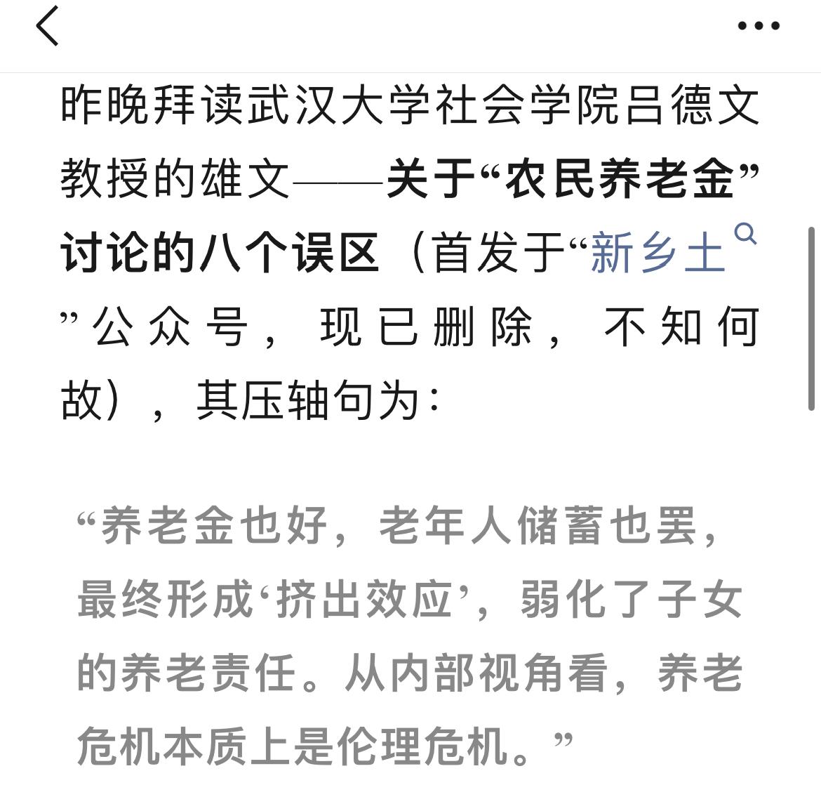 武汉大学吕德文教授认为,提高农民的养老金会弱化子女的养老责任。这是他在雄文《关于农民养老金讨论的 8 个误区》最后得出的结论。 这段时间很多代表都为提高农民养老金而建言献策,吕教授则认为提高农民养老金在经济下行期会对国家财政造成巨大压力。并且一味提高农民养老金,作为老年农民子女,他们赡养老人的责任就会缺失,打破农村养儿防老的传统,不利于农村的稳定。 吕教授自诩了解农村,是扎根农村进行田野调查的知名学者,可是对农村的现状却一无所知。大量农村老人七八十岁还在田间劳作,不是因为他们的子女不孝,而是子女的收入也不高,压根无法顾及他们。老年人为了减轻儿女的负担,为了生活,生病吃药,还有应付各种人情开支。必须自己努力挣钱,否则日子会非常的艰难。