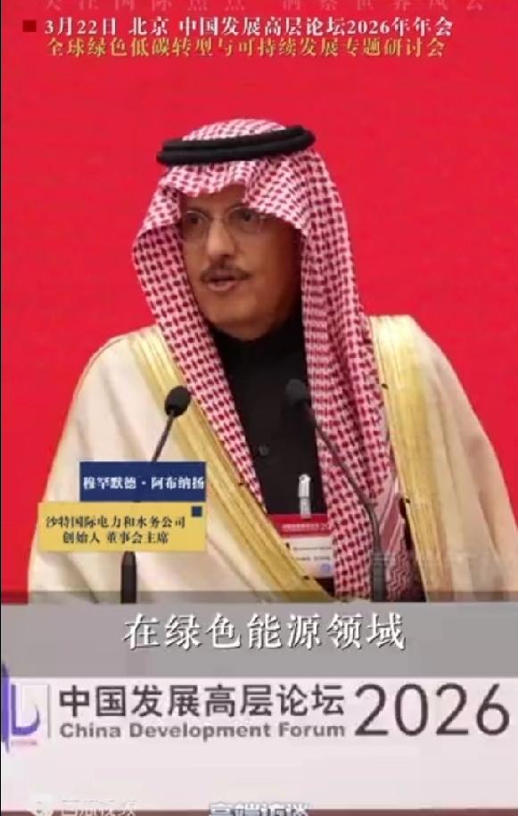 3月22 - 23日,中国发展高层论坛2026年年会在北京召开。沙特国际电力和水务公司创始人穆罕默德·阿布纳扬在会上直言,没有中国,就没有世界的绿色转型。他感谢中国的绿色战略,称中国在绿色能源领域的创新、发展与规模扩大方面的成就引领全球。中国不仅造福自身,其工作也让全球人民受益。 确实,中国在绿色能源领域成就空前,定位清晰,成了世界表率,很多国家都在学习。像绿氢等面向未来的技术,中国也在积极探索。全球绿色转型,中国作用不可或缺。