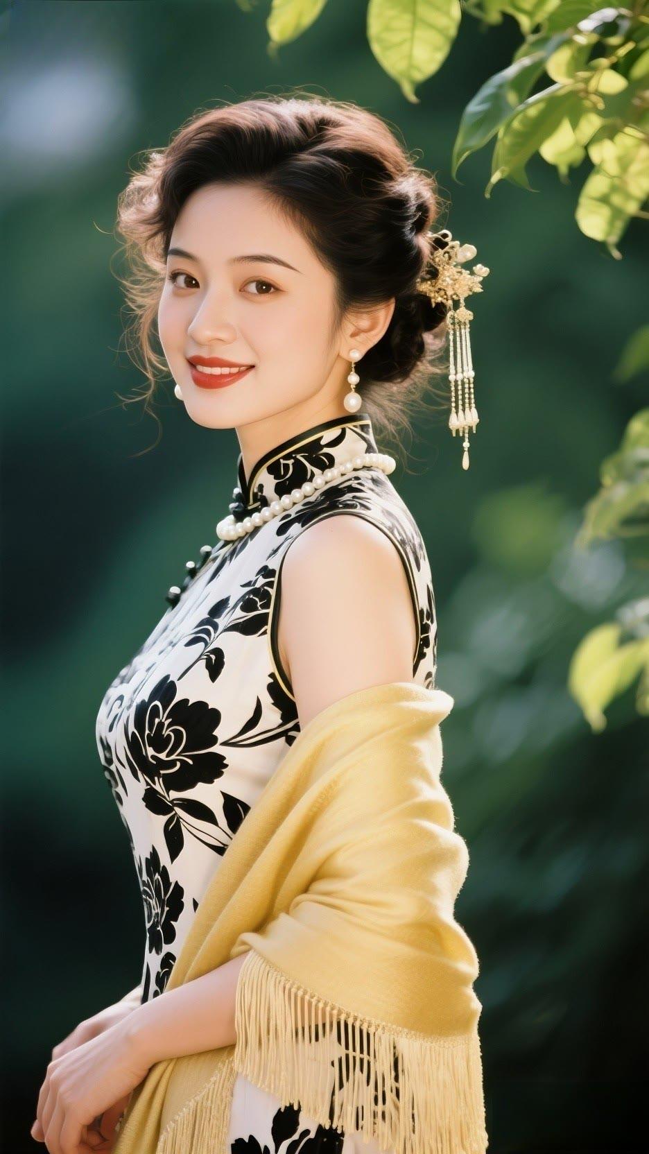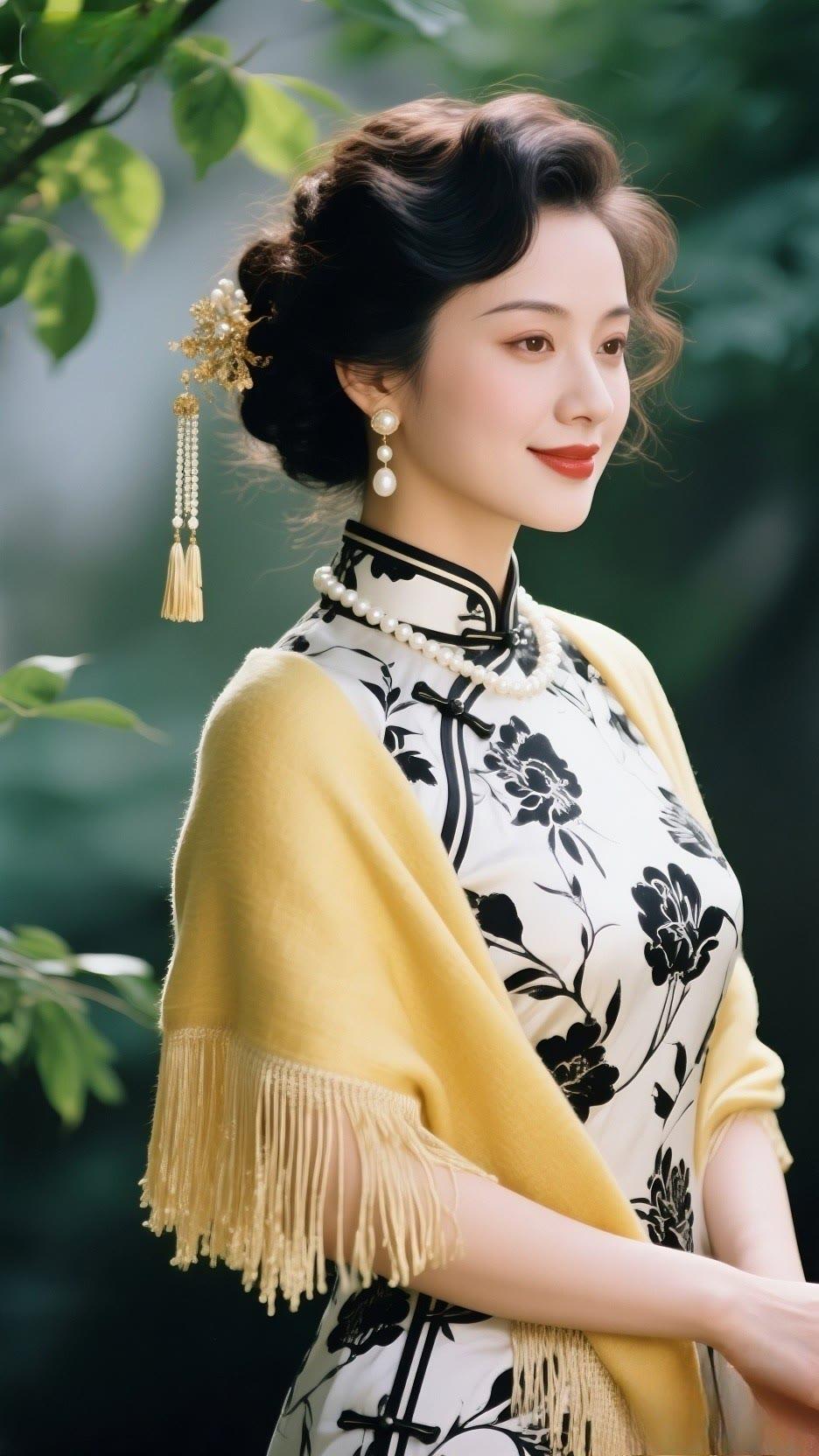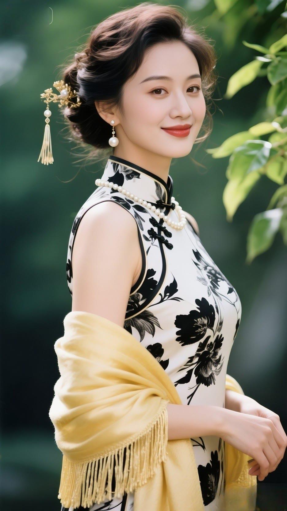 绝色成熟女子着华丽繁复锦绣旗袍,乌黑高挽发髻,肌肤无瑕,身姿婀娜比例均衡,圣洁高