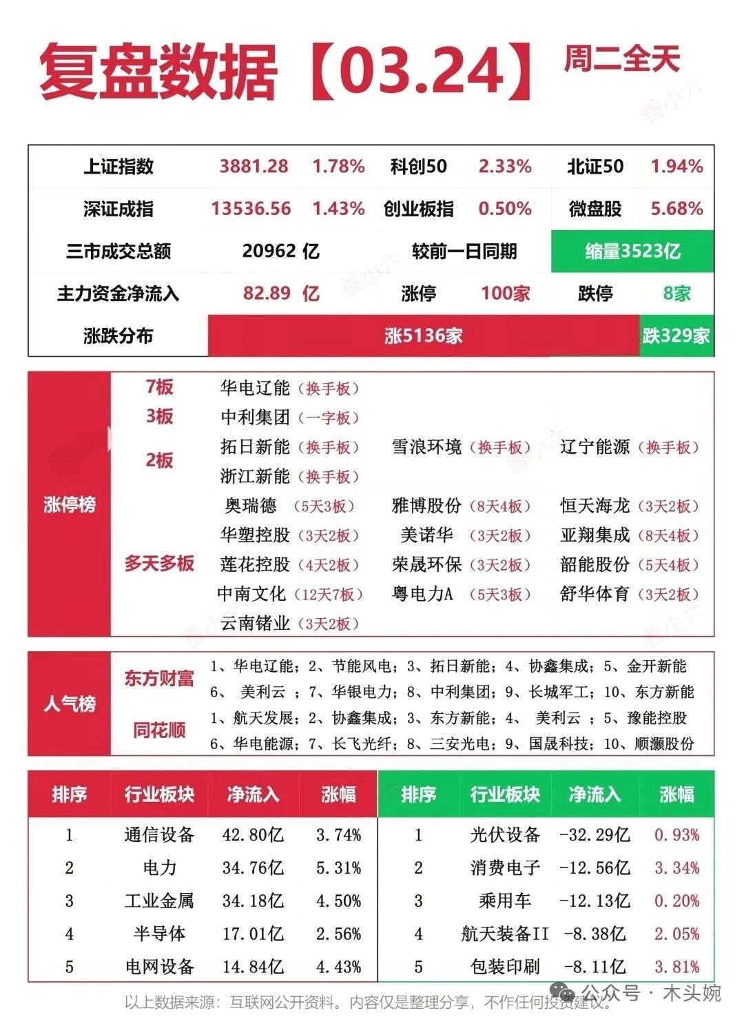 3月24日A股复盘整理:放量普涨!电力与算力成资金主战场! 三大指数集体收涨,沪指站稳3880点,两市成交额突破2万亿,较前一日放量超3500亿,超5100只个股上涨,赚钱效应爆棚! 24日主力资金净流入超82亿,通信设备、电力、工业金属位列净流入前三;光伏设备、消费电子等板块资金流出居前。 ⚠️ 风险提示:以上数据源自公开信息整理,仅为复盘分享,不构成任何投资建议,股市有风险,投资需谨慎。