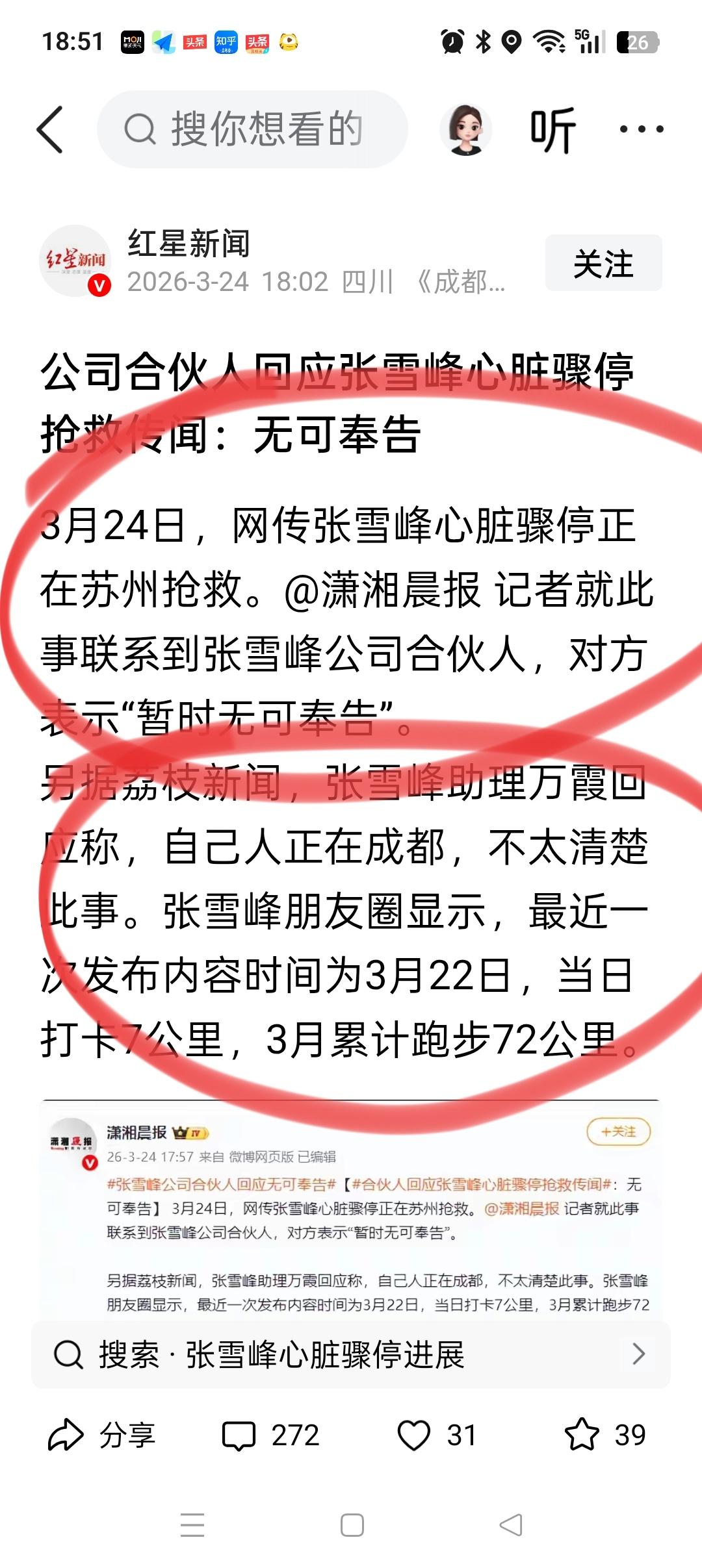 张雪峰被传正在抢救?多方回应: 助理万霞:她人在成都,不清楚! 公司合伙人:无可奉告! 公司接线人员:不清楚,不方便告知! 而张雪峰最近的一次朋友圈,是在3月22号跑了7公里,3月累计72公里。 看得出来,张雪峰是一个喜欢运动的人,且本身身体还不错。 去年我外甥也是在张雪峰的帮助下,报考了自己喜欢的专业,一家人都很满意。 希望这真的只是个假消息。毕竟张雪峰老师的人品确实没话说,很正直的一个人[玫瑰][玫瑰]