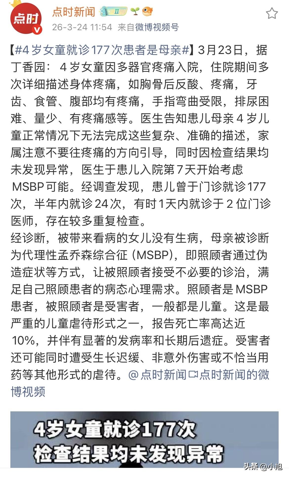4岁的女孩躺在病床上,对着医生说“胸骨后反酸”。 这不是医生教的。是孩子自己说出来的,一字一句,清清楚楚。胸骨后、反酸、疼痛。一个4岁的孩子,连“反酸”这个词都不该认识。 她还说了更多。牙齿疼,食管疼,肚子疼,手指弯不过来,尿不出来,尿的时候也疼。从头到脚,从里到外,她能说出身体每一个部位的“毛病”。 医生听完就起了疑心。 正常的4岁孩子,能把哪儿疼说清楚就不错了。能说出“反酸”这种词,还知道疼的具体位置,这不对劲。要么是大人教的,要么是大人天天在耳边念叨,念到孩子自己都信了。 医院给孩子做了一堆检查。抽血,拍片子,CT,能查的都查了。结果全是阴性,啥毛病没有。 但孩子的妈妈不依不饶。每天查房,她都能掏出手机,打开浏览器,给医生看她搜了什么病。今天搜“钙卫蛋白”,明天搜“风湿因子”,拿着这些词质问医生:你们是不是漏诊了? 她的手机相册里存满了照片。孩子手指稍微有点红,她能拍十几张,放大给你看,说这是肿胀,这是炎症,必须查。 到了第7天,医院把孩子的情况梳理了一遍,调出门诊记录。 177次。 这个4岁的女孩,光在这一家医院,就看了177次门诊。半年之内24次。有时候一天之内挂两个不同的专家号。同一个检查,翻来覆去做。 这哪里是看病,这是把医院当家了。 医生觉得不对,找孩子单独聊了一次。病房里没有妈妈在,医生问孩子,你哪里不舒服?孩子说了句让所有人都没想到的话: “妈妈说我有病,治好了才能上学。跟小伙伴一起玩的时候不痛。” 这句话就这一句,把整件事给戳穿了。 孩子根本不觉得自己有病。她说的那些复杂症状,是妈妈教的,是妈妈天天在她耳边念,念到她背下来了。她配合妈妈,是因为妈妈告诉她,有病才能上学,没病就不能跟小伙伴玩。 一个4岁的孩子,被迫学会了说谎。 医院联系了孩子外公。老人在电话里说了几句,信息量很大。他说他女儿年轻的时候在外面打工,挣的钱不干别的,全往医院送。自己给自己看病,看了一年又一年。后来生了孩子,就开始带孩子看病。家里人劝过,根本劝不住。 你看出来了吗?这女人不是突然变成这样的。她年轻的时候,病的就不是身体,是心。但她把所有的钱和时间都砸在医院里,给自己看病,给自己找存在感。后来有了孩子,孩子就成了她新的“病”。 她需要“照顾病人”这件事。没有病人,她的人生就没有意义。 所以她要让孩子生病。孩子没病,她就给孩子编病。孩子不会说,她就教孩子说。孩子不配合,她就用“治好才能上学”这种话哄着孩子配合。 外人看,她是个伟大的母亲。孩子一身病,她不离不弃,四处求医。多感人啊。 但实际上呢?孩子根本没病。是这个妈妈有病。她病在心里,却让孩子替她吃药。 医学上管这叫代理性孟乔森综合征。大白话就是,照顾者靠让被照顾者生病,来满足自己“我在照顾病人”的心理需求。 这个病的死亡率接近10%。不是孩子本身有病死的,是被当成病人折腾死的。反复检查,反复用药,反复手术,真能折腾死人。 这个4岁的女孩运气好,被医生识破了。但有个问题更让人难受: 她以后怎么办?她还分得清什么是真疼,什么是假疼吗?她还会不会在某个时候,下意识地说出“我胸骨后反酸”这种话? 这些话是妈妈塞给她的。妈妈不在了,这些话还在。 外公说,他女儿年轻时就爱给自己看病。这说明什么?说明这个病可能不是一代人的事。这个女人小时候经历过什么,没人知道。但有一点可以肯定:她从小就没有学会正常的、不靠生病来获得关注的方式。 她只能靠“我有病”或者“我的孩子有病”来证明自己存在。 现在问题来了:这个4岁的孩子,将来长大了,会不会也变成她妈妈那样? 这起病例刊登在2022年的《中华实用儿科临床杂志》上,是中国大陆报道的第一例儿童代理性孟乔森综合征。 你觉得,这个孩子以后还能正常长大吗? 来源:点时新闻、《中华实用儿科临床杂志》2022年第37卷第3期《中国大陆首例儿童代理性孟乔森综合征》等