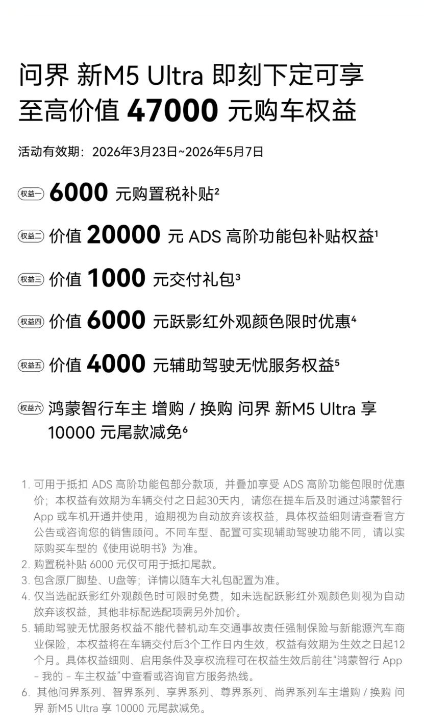 家用 SUV 选问界新 M5 Ultra,亲子春游幸福感直接拉满 带娃春日出行,问界新 M5 Ultra 真的很贴心。车内空间宽敞,孩子坐得自在,27 处储物空间收纳零碎物品超方便。舒云座椅柔软支撑到位,副驾电动腿托让家人一路放松,全景天幕看云看树,小朋友格外开心。3.5kW 外放电在郊外随时用电,野餐、娱乐都方便。安全方面更是拉满,高强度钢车身、全向防碰撞系统、中汽中心 5A 路面冲击认证,出行更安心。华为乾崑智驾ADS 4.1减少驾驶压力,城区通勤更轻松。现在购车权益丰厚,至高47000 元购车权益,直接省下一大笔。20 万级兼顾家用、舒适、安全与户外乐趣,品质口碑双在线,非常适合家庭用户。