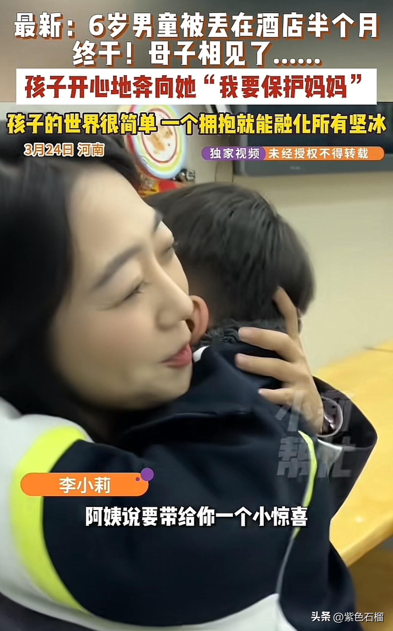 河南这个6岁小男孩,被丢在酒店半个多月,懂事得让人心疼! 3月24日,小男孩的妈妈终于现身。时隔20多天,男孩再次紧紧抱住妈妈。对面妈妈的失踪,他没有一句抱怨,只是问妈妈:“去哪里了?你咋没回来?”还懂事地说:“我不怪妈妈,我自己会照顾自己。我长大了要保护妈妈。”这样懂事的孩子,妈妈怎么舍得把他一个人丢下的? 与此同时,男孩的姥爷也出现了。他明确表示,自己好几年没见孩子了,因和女儿有误会,所以不了解情况。下一步,他会和孩子姥姥一起照顾小男孩。 孩子的世界无比纯真,他所求甚少,妈妈的一个拥抱,就能让他忘却这些天的遭遇。 希望在接下来的日子里,这个孩子能在姥姥、姥爷和妈妈的呵护下健康成长! (素材来源:小莉帮忙)