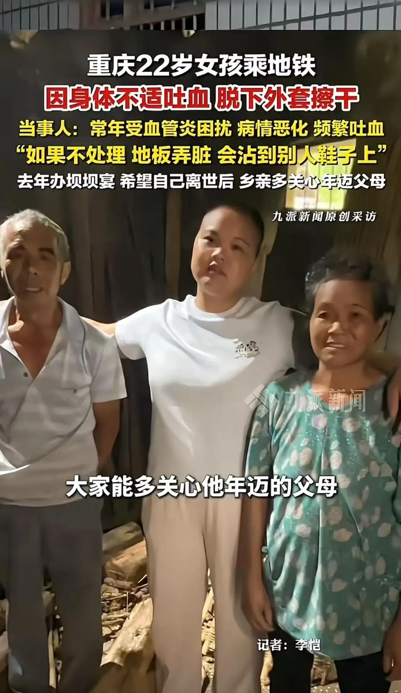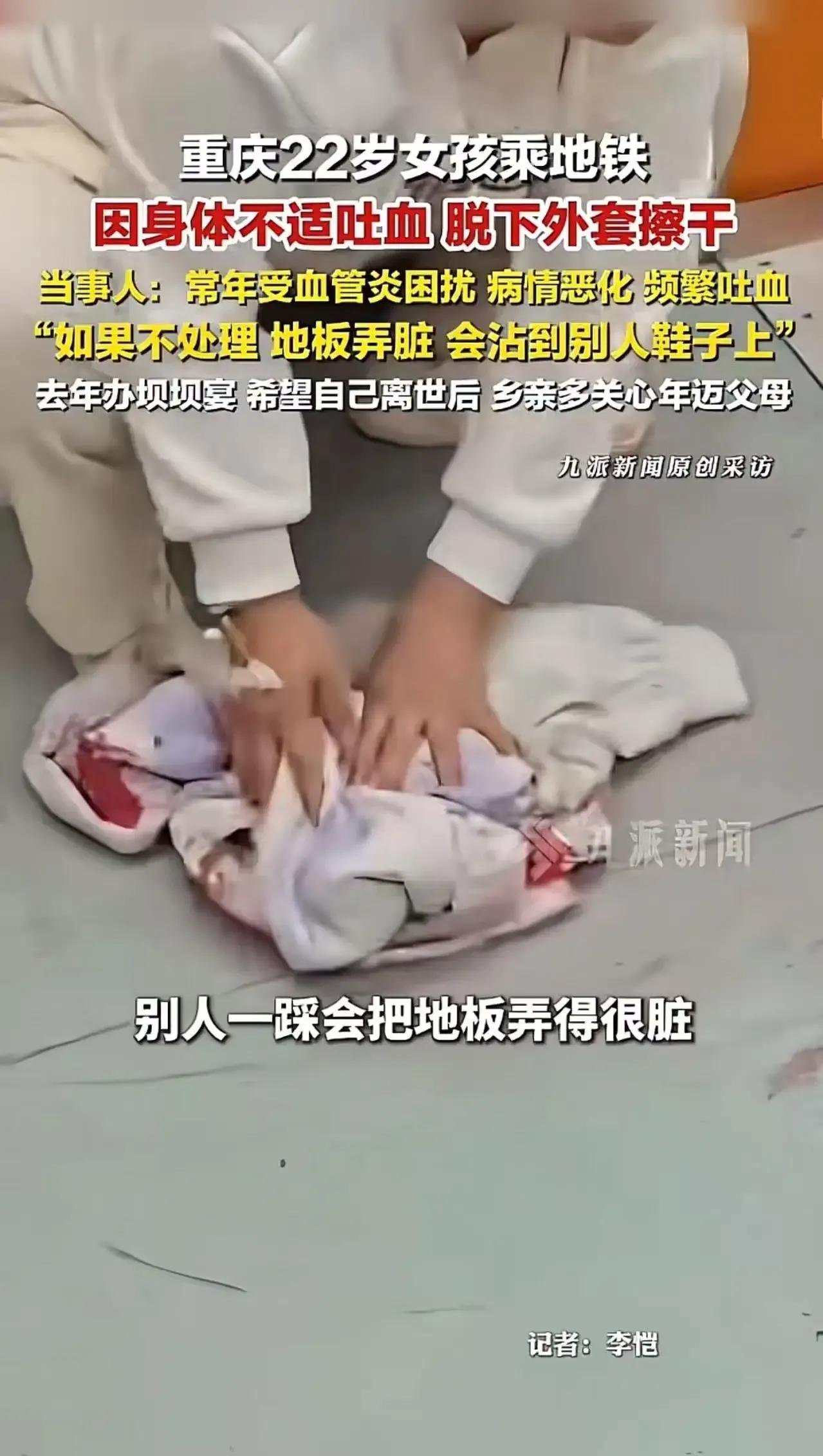重庆地铁上的一幕让人动容,一位22岁的姑娘在吐血后,竟脱下外套把地擦干,这究竟是怎样一位善良的姑娘呢? 据了解,这位姑娘常年受血管炎的困扰,病情已经恶化到频繁吐血的地步。然而,在如此危急的情况下,她首先想到的并不是自己的安危,而是怕吐出的血弄脏车厢地板,沾到别人的鞋子上。于是,她毫不犹豫地脱下自己的外套,蹲在地上,一点一点地擦拭着血迹。这一幕,让整个车厢的人都为之震撼,大家纷纷投来敬佩的目光。有网友表示,看到她蹲在那用衣服擦血的那一刻,眼泪直接下来了,这是什么神仙姑娘啊!自己都在鬼门关徘徊,心里想的却是别人的鞋子干不干净。这份善良和无私,让人感受到了人间的温暖和美好。 这位重庆姑娘的善良举动,无疑给我们上了一堂生动的课。在困境中,她依然保持着对他人的关怀和尊重,这种精神值得我们每一个人学习。大家对此有什么看法呢?快来评论区留言分享吧!地铁悲剧 地铁上感人的事 重庆女孩坠江