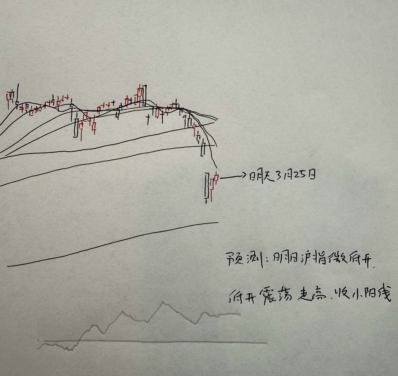 所以,综合以上分析,我认为明天市场指数还有望延续今天尾盘的反弹状态。那么明天A股到底怎么走?大家请看下图——关于明天走势的手绘预测图。