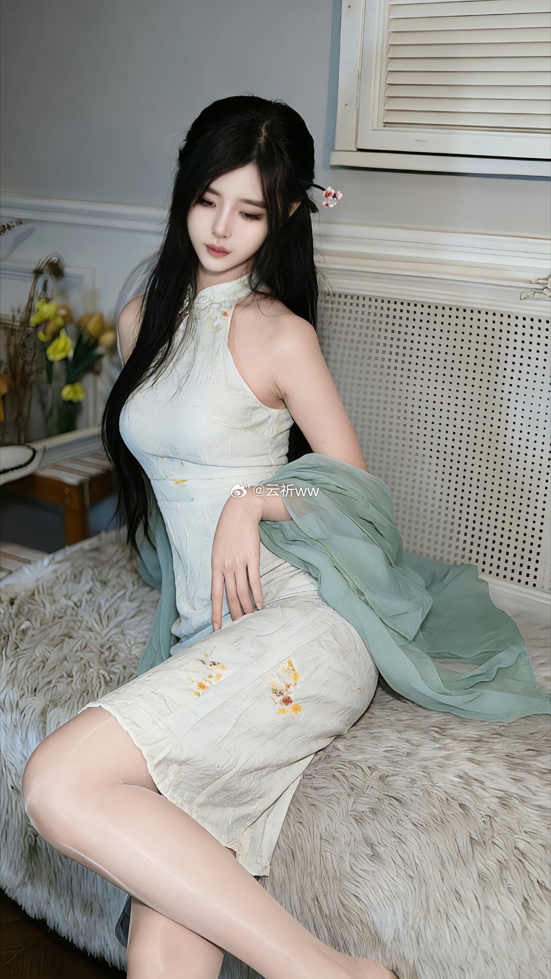 当复古旗袍撞上现代黑丝,是旧时光与新潮流的私密对话。她半倚在百叶窗边,黑色旗袍
