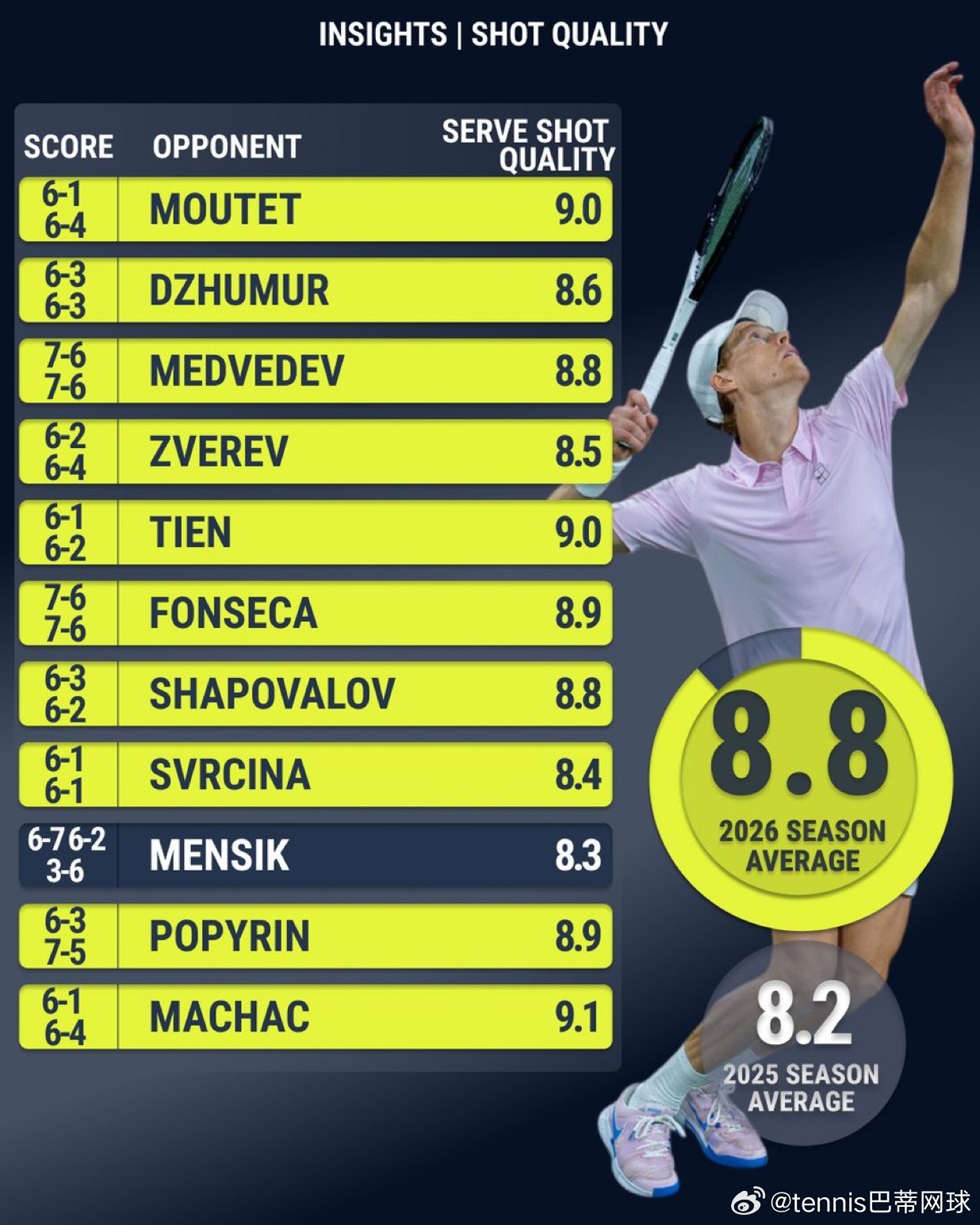 以下是扬尼克·辛纳2026年的发球质量评分,相较2025赛季平均水平,今年表现显著提升📈