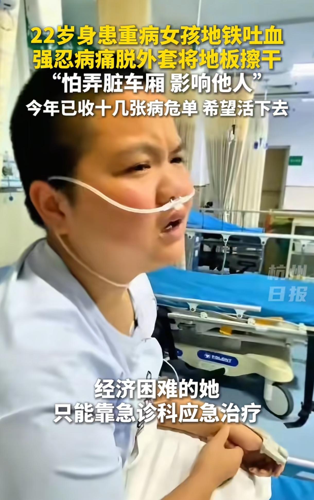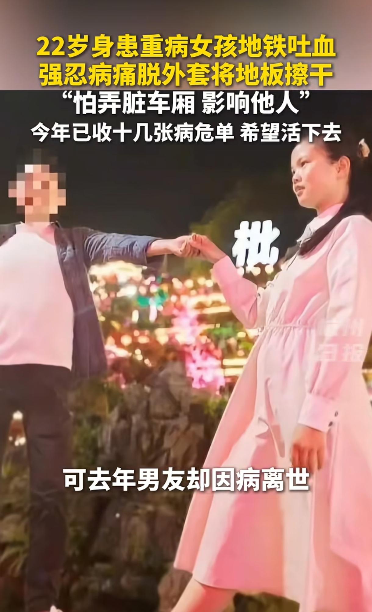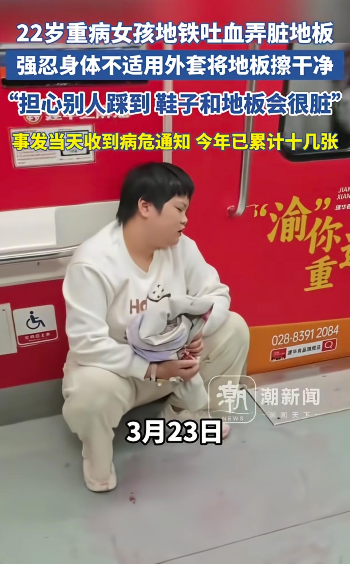 地铁上,一位女孩突然口吐鲜血溅了一地,女孩身上没有纸巾,毫不犹豫脱掉外套蹲地上一点点擦拭血迹。这一幕令人泪奔,因为女孩是一位罕见病患者,当天还收到了病危通知书,而即便自己重病缠身,女孩也没有对弄脏地板视而不见,反而果断脱衣擦净。 网友泪目不已:生活以痛吻她,她却报之以温柔;这是女孩刻在骨子里的善良与教养。 (来源:杭州日报、极目新闻等) 3月23日,在重庆地铁一号线上,22岁重病女孩胡心瑶乘地铁去重庆附属第一医院输液,因为消化道出血,她上车时就感到不舒服想要吐血了。 当地铁即将行至大坪站时,胡心瑶实在忍不住,大口吐出鲜血,血液顿时溅了一地,那位置正好是上下车通道口,这令胡心瑶十分尴尬又窘迫。 虽然这时的她已经感到极度不舒服了,但她第一反应不是逃避或坐着休息,而是担心弄脏了地板,也会弄脏乘客鞋子。 她手边没有纸巾可用,情急之下,直接脱下身上的外套,蹲下身用衣服一点点仔细擦去地上的血迹,没有半分犹豫。 那件衣服胡心瑶十分喜爱,她穿了5年,但此刻却被她拿来擦地板,最关键的是此刻的她身体极度虚弱。 她一边擦拭,一边停下来休息,就这么强忍着身体疼痛与不适,又累、又极度认真地将地板一点点擦拭干净了,看得人泪眼婆娑。 更令人心疼的是,事发这天胡心瑶还收到了病危通知书,而这样的通知书她在今年短短3个多月里就已收到了10多张。 原来,胡心瑶2018年就患上了一种罕见病例:ANCA相关性血管炎,已经治病了8年,期间一度发展为肾衰竭、心力衰竭、肺部感染、消化道出血等,一天吐血两三回。 病情发展到了2025年,胡心瑶已经病魔缠身,随时都可能没命,去年一年收到了10多张病危通知单,今年更厉害才三个多月就收到10多张,3月23日坐地铁去医院应急还收到过一张,真是太令人心疼了。 因家境拮据,无力承担住院费用,她只能每天去急诊科应急处理。家中尚有年迈双亲需要照料,为不让老人操心劳累,她每次都独自一人去医院就医,那天她刚上地铁时消化道就出血了吐了一地板,看得人真要哭死啊。 真是“麻绳专挑苦命人”啊,胡心瑶曾是一位爱美、对爱情憧憬的女孩,但是重病剥夺了她对爱情的向往。她谈过一个当辅警的男友,但因为生了重病,为不拖累对方两次拒绝男友求婚,不料她的善良与成全并没换来男友的幸福人生。 2025年8月31日,26岁男友因患急性重症胰腺炎,经全力抢救仍不幸离世,临终前将5万块(全部积蓄)留给了胡心瑶,让她好好替他活下去。 两人都是极有爱心之人,男友是一名警察,哪料英年早逝。更虐心的是,两人2024年相恋了仅仅两个月,对方明知她重病还两次求婚,胡心瑶“狠心”提分手,对方依旧心意坚定,分手后匿名资助胡心瑶近8万块,而这也是因为胡心瑶身上有着耀眼的闪光点。直到男友去世,胡心瑶才知那位一直帮助好的爱心网友就是男友。 胡心瑶也是素质高、善良的人,哪怕身患重病也不拖累父母与男友,甚至不连累车上乘客,不让乘客踩到自己吐的鲜血弄脏地板,真是把教养、善良与温柔刻在了骨子里。 胡心瑶与男友的故事太让人心碎,一位拼命求,一位拼命推;一位拼命守护,把所有钱都留给她治病,一位又来到他去世的医院抢救,命运真是太残忍了。 其实胡心瑶重病的事大家并不知情,但是善良却让她自带光芒,她在地铁上擦拭地板这一幕被网友发到网上后,大家这才得知这位善良温柔、充满教养且身患重病的坚强姑娘。 3月23日晚上视频发酵以后,大量爱心人士捐款,24日凌晨1点就被转入成都华西医院抢救,上午已经在排队救治了。 而这家医院刚好是男友去世前住过的医院,命运就是这么神奇,希望男友冥冥之中保佑善良的胡心瑶早日摆脱病魔,为他好好活下去。 世界上还是好人多,善良也是会传染人的,胡心瑶事件发生后,多家干洗店表示愿意无偿清洗那件外套,只因它是女孩心爱的衣服;无数网友与机构也都纷纷捐款助力华西医治胡心瑶。 胡心瑶的事迹以及爱心人士的善心,看得人泪流满面。 对于胡心瑶而言,生活以痛吻她,她却报之以温柔,生活给了她最苦的剧本,她却把自己活成了最温柔的模样。她不抱怨,不忽视,不把痛苦转嫁给他人,这么善良、干净、纯粹的女孩,不该这么悲惨啊,衷心希望她早日痊愈。 对爱心人士们而言,他们不是同情弱者,而是致敬一个哪怕被命运蹉跎、依然选择善良与体面的灵魂! 衷心希望胡心瑶早日摆脱病魔,也希望死神放过她,给善良的她一个安稳、幸福的人生,愿好人好报!