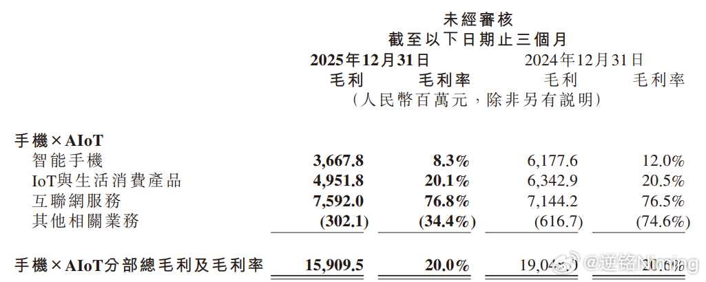 对小米来说,手机业务算是第四季度压力最大的业务了,因为内存上涨,毛利率有明显的下降,直接从第三季度的11.1%降到了8.3%。要知道第四季度主要卖的还都是高端机,利润空间还是有一些的,要是高端化没搞成的话,成绩或许要更难看。