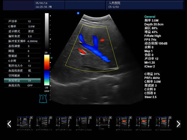 【D模式】--多普勒模式利用多普勒效应来检测血流速度和方向,根据血流向探头靠近或远离,显示不同的颜色,通常红色表示向探头靠近,蓝色表示远离。