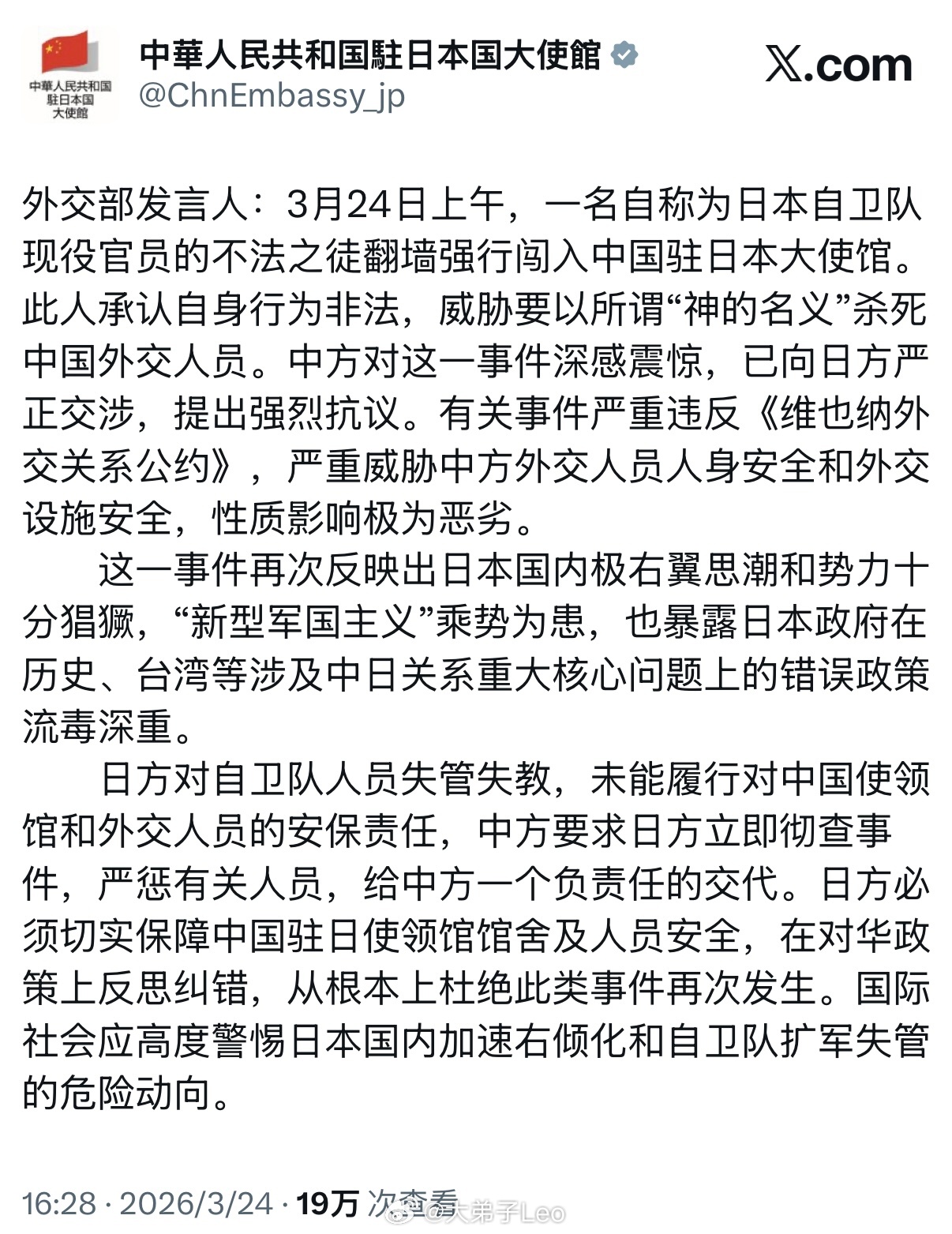 入侵或攻击他国大使馆在任何意义上都可以被视为战争行为一日本人威胁要杀中国外交人员