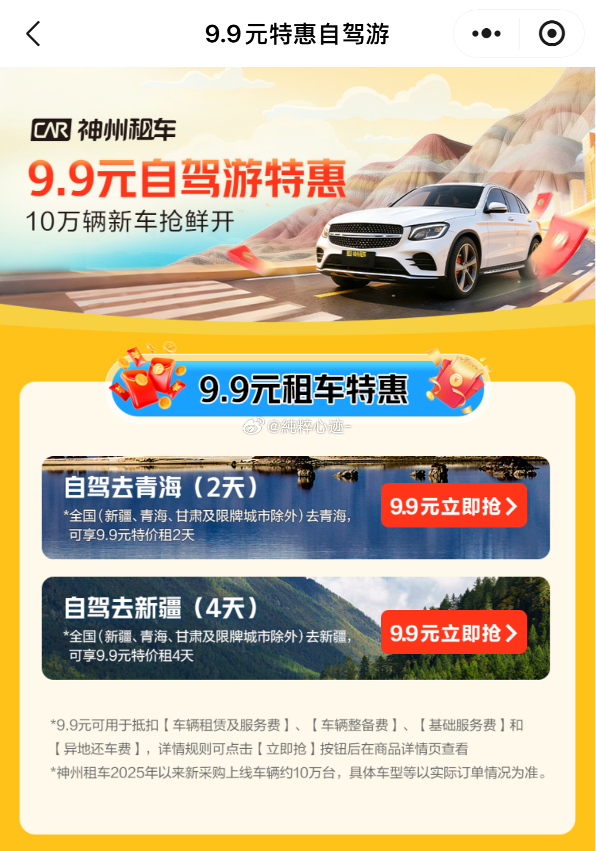 春游就是在和春天交换能量 是春天的vibe呀!青海的美景真的得亲眼看啊!咱就是说没车的也可以自驾!毕竟最近租车活动蛮划算的!神州租车现在有活动能抽3天免租券,还有9.9元自驾游特惠~不管哪个都是划算的!神州山海 此生必驾神州春游季神州租车 最近想自驾去春游的都来看看哦!
