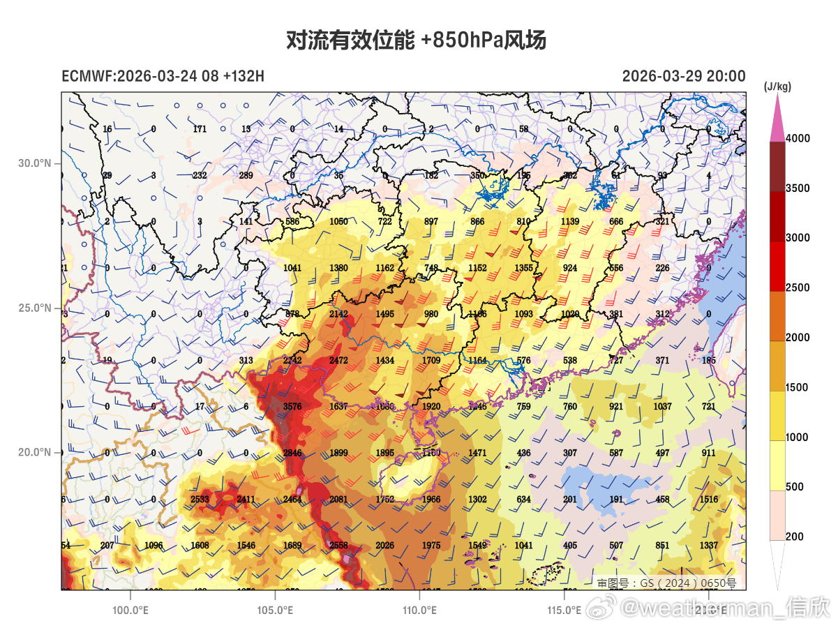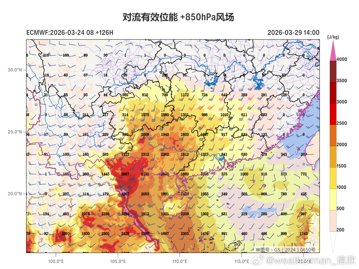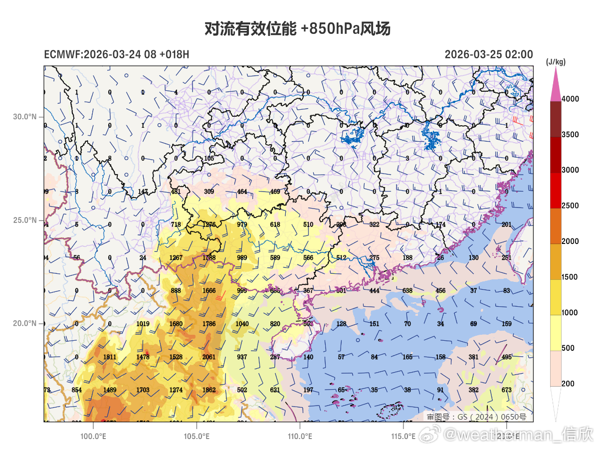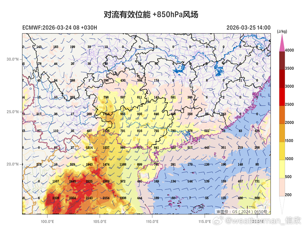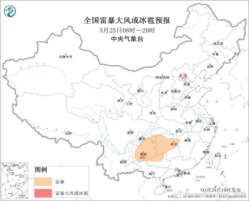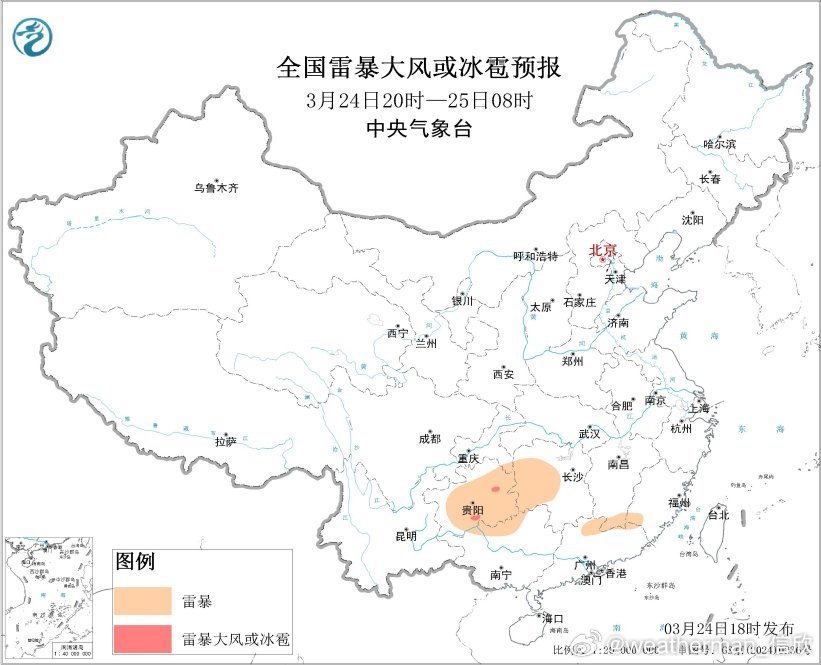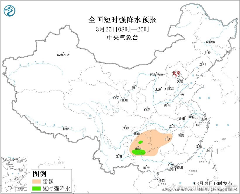 【对流】预计3月24日20时至25日20时,贵州中南部、广西西北部等地的部分地区将有短时强降水天气,小时雨量20-30毫米,局地可达40毫米以上;另外,贵州东部和西南部等地的局地将有雷暴大风或冰雹天气。