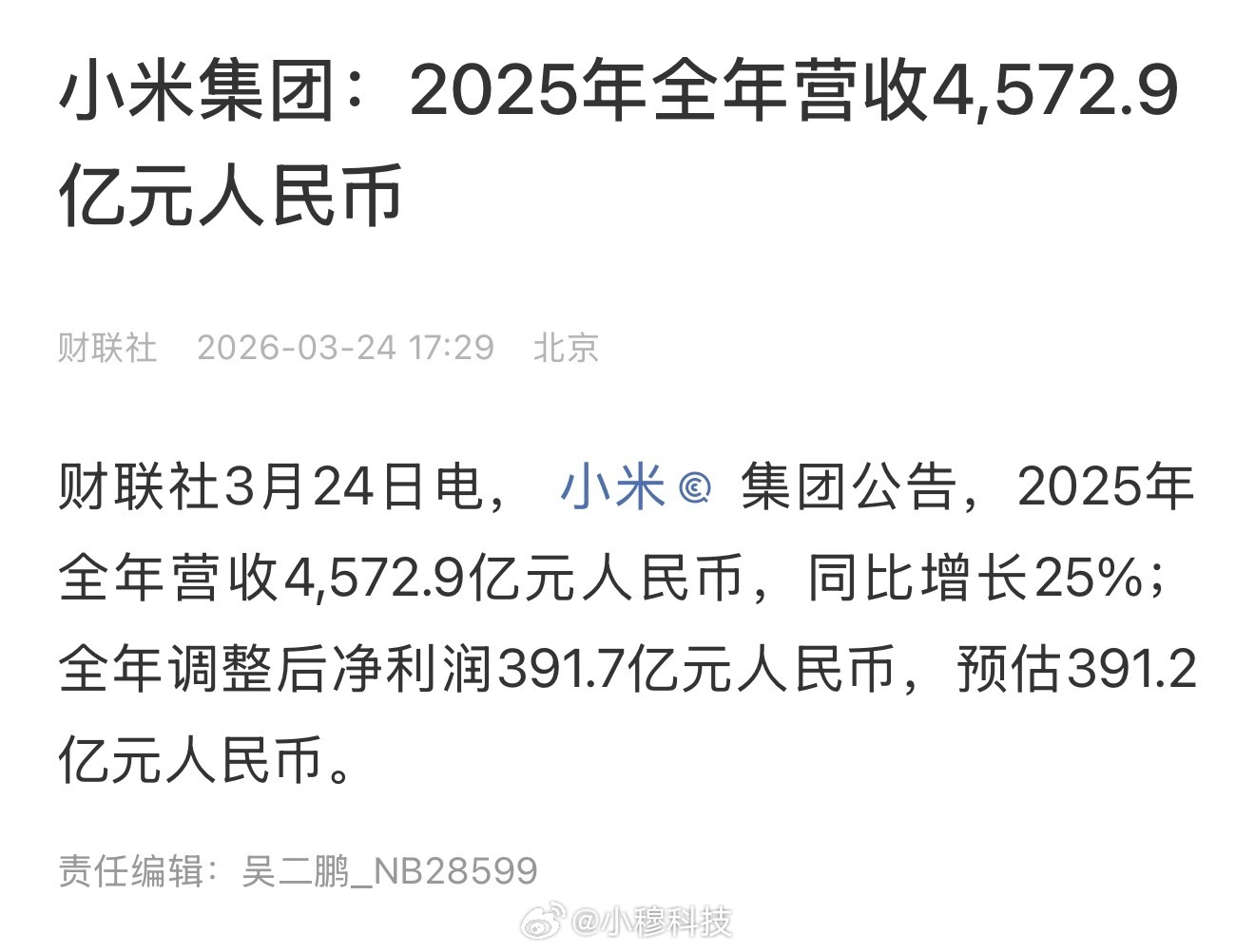 小米2025年财报小米公布25年成绩,25年营收4573亿,净利润392亿,净利