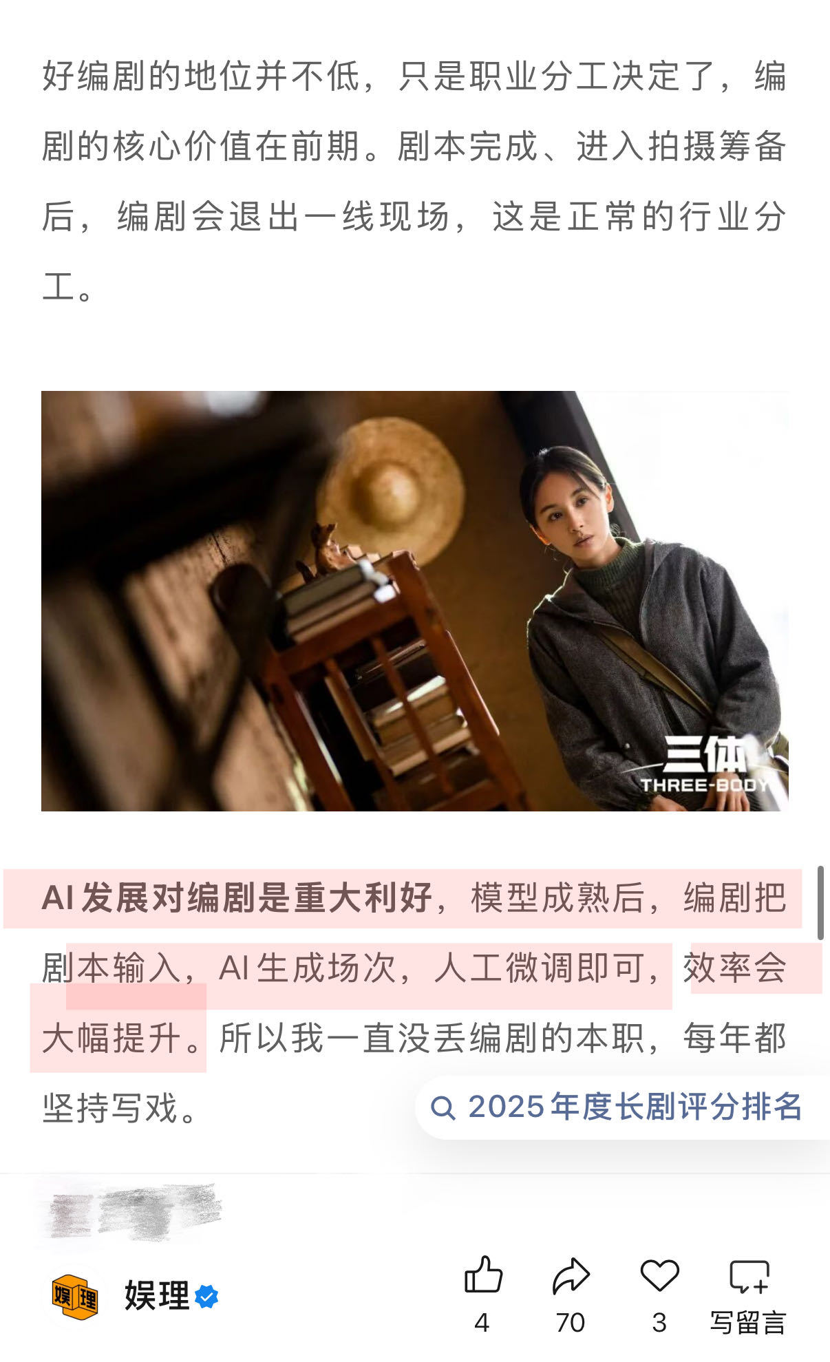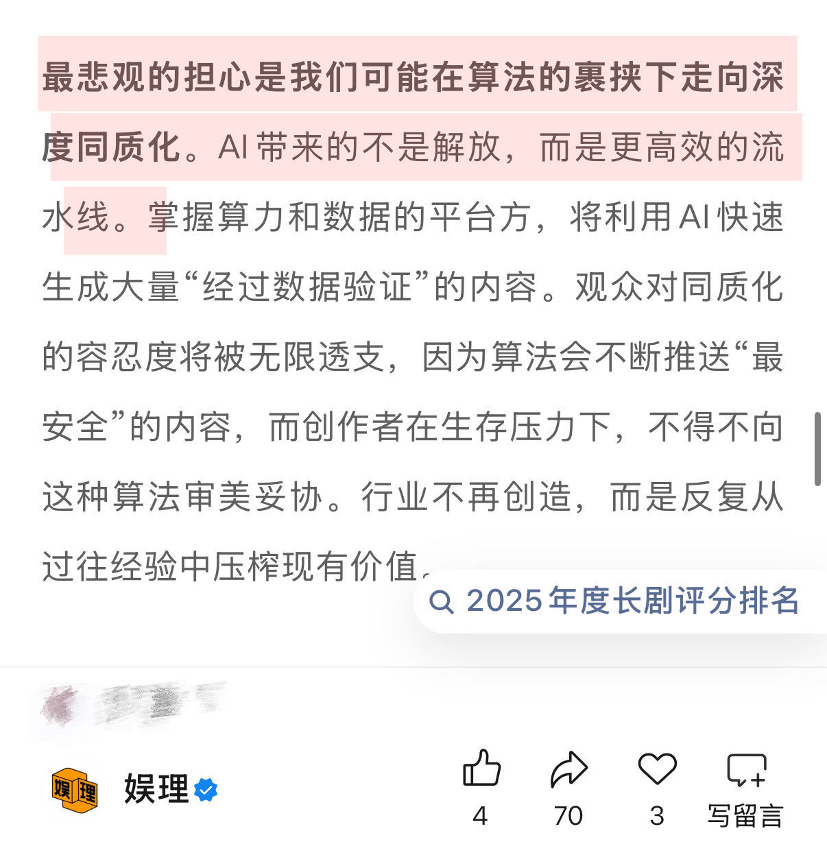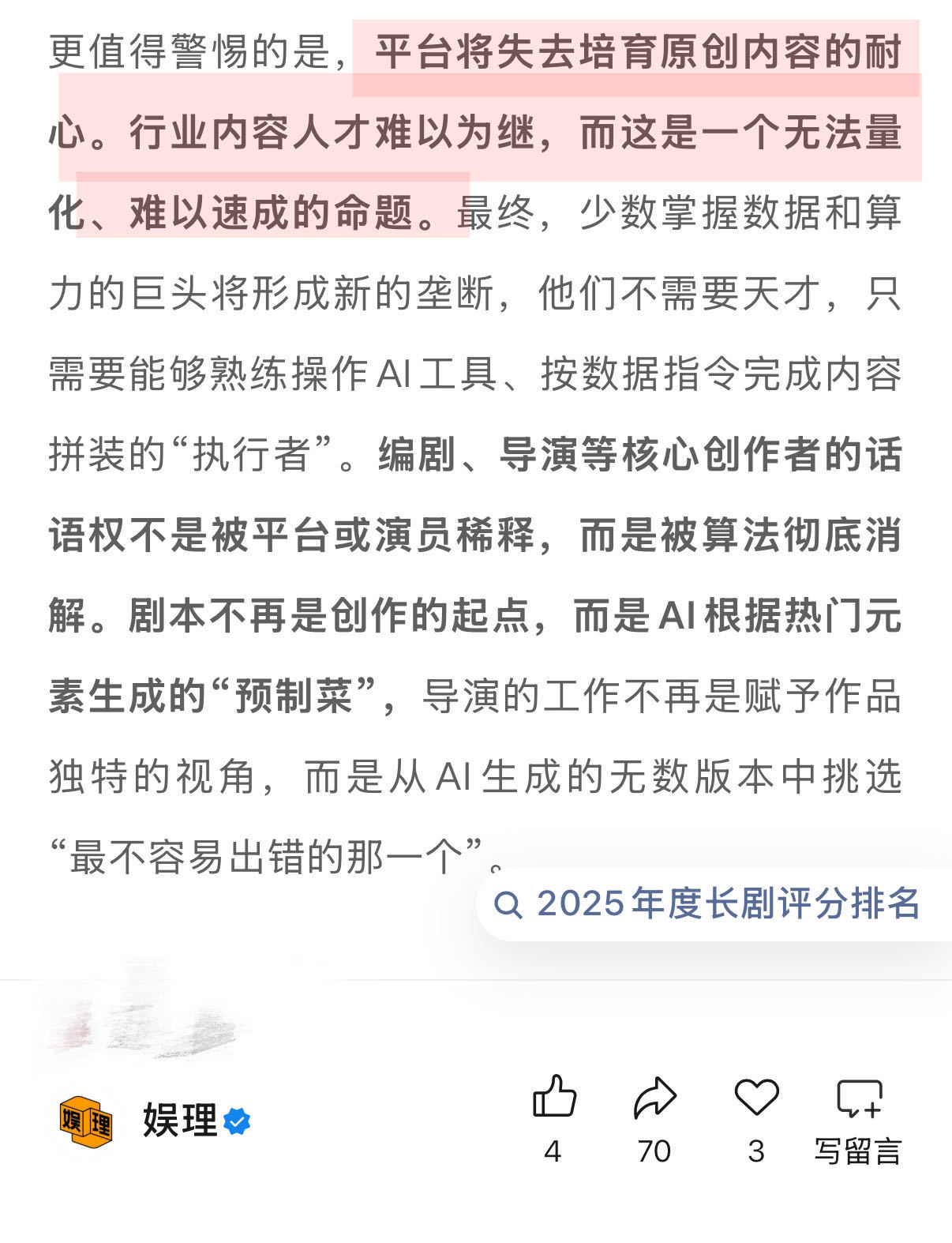 侯鸿亮担心AI变成更高效的流水线未来演员演一个戏或许只需3天5天 AI对影视行业的影响呈现鲜明两面性:一方面,有观点认为“AI发展对编剧是重大利好,模型成熟后,编剧把剧本输入,AI生成场次,人工微调即可,效率会大幅提升”;另一方面,AI若沦为高效流水线,将让平台失去培育原创内容的耐心,内容人才难以为继,最终让创作彻底向算法审美妥协。