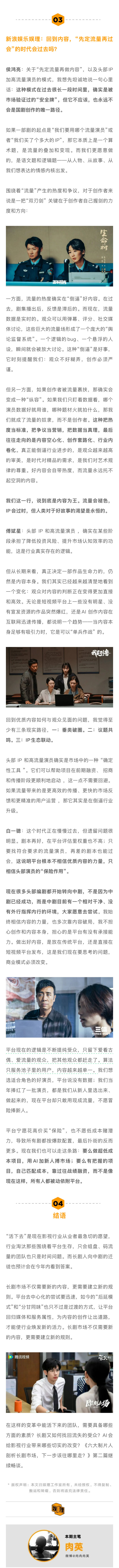 业内谈长剧先定流量再过会现象 未来演员演一个戏或许只需3天5天 侯鸿亮谈分账模式的变革,称其推动了行业从“流量导向”向“内容本位”回归。“分账模式改变的风险并非由单一主体承担,最直接承压的是制作方。平台承担的风险集中在两方面:一是内容投资与运营风险;二是规则落地的风险,数据不透明、规则不被认可,也会引发合作纠纷,影响内容供给…” 六大制片人谈长剧未来↓