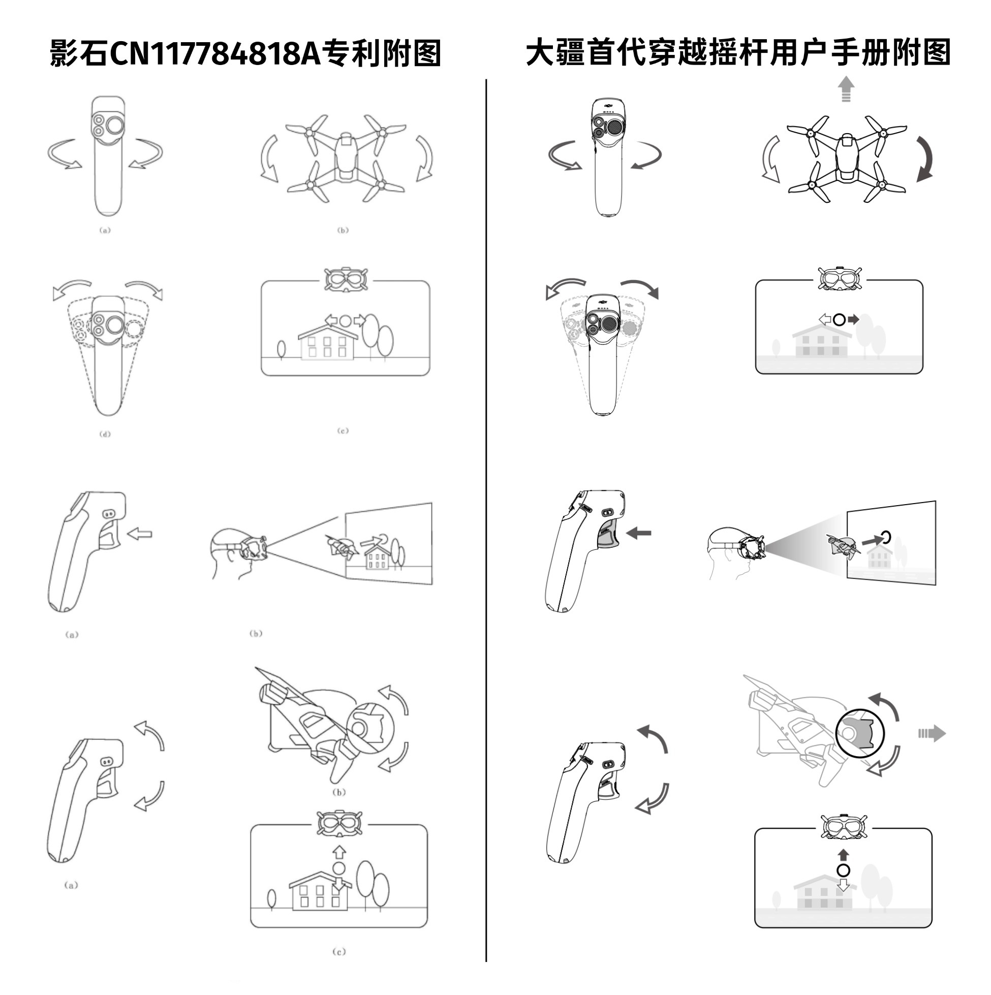 直观感受就是:专利图都摆出来了,重合度高到离谱。涉案专利附图和大疆早年穿越摇杆用户手册几乎一模一样,国内申请还特意“请求不公布姓名”,结果国际申请直接露了发明人——还是前大疆核心研发,离职没多久就出现在影石专利里。