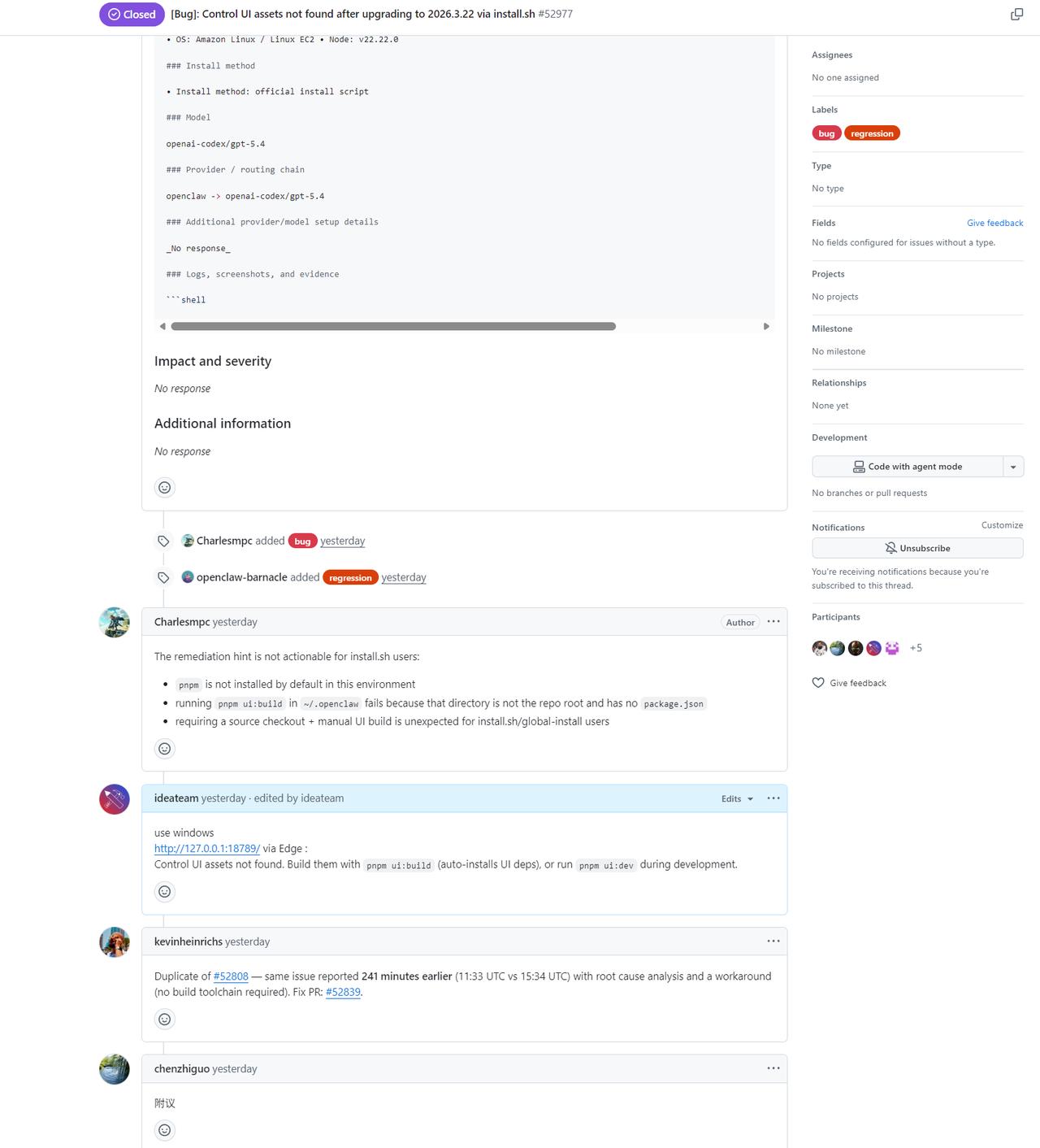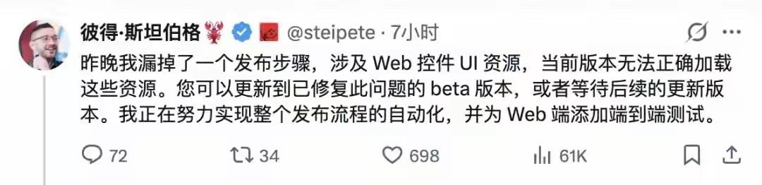 昨天openclaw官方3.23版本升级出问题了: 1.昨天很晚也在养龙虾,突然接到可以升级3.23的提示,就主动去升级了,结果升级后龙虾界面都无法正常进入,折腾了10几分钟还是不行,就去github的官方issues去找问题,刚好看到已经有人提出来问题了,我也顺便提交补充了存在的问题,把龙虾回退到3.13版本了。 2.有人提出是大版本更新,连UI界面都跟以往不同了,但是这跨度太大了吧,普通人都不一定能解决。也有人贴出可以手动复制更换资源文件进行紧急处理,但是如果升级后无法自动加载UI,还还算自动化的龙虾吗? 3.第二天,官方发出3.23-1和3.23.2版本,各自媒体也都开始沸腾炸锅了。 4.龙虾创始人自己也来说明原因了。