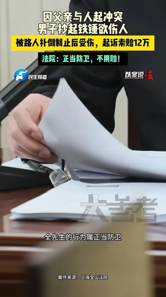 “大快人心!”上海,一男子因为父亲与人发生冲突,男子打了对方后,又抄起铁锤想要伤人,此时一名路人立马冲上去将男子扑倒,导致男子的手掌被锤柄硌伤,男子事后将路人告上法庭,要求赔偿12万余元,法院:正当防卫,不用赔! 2023年10月上海宝山区一家电动自行车店门口,店主的父亲和一位顾客因为一点小事吵了起来。吵着吵着,火气上来,两人就动了手。 店主的儿子邱先生看到自己父亲跟人打起来了,想都没想就冲了上去。他不是去拉架,而是加入了战团,挥起拳头就朝楚先生的头上打。这还不够,打红了眼的邱先生,弯腰就从地上捡起了一把修车用的铁锤。 铁锤在手事情的性质就变了,拳头打架可能只是皮肉伤,这铁锤要是抡下去,砸到头上,后果不堪设想。就在这个节骨眼上,路过的全先生看到了。他当时心里就一个念头不能让铁锤砸下去!身体比脑子反应还快,他一个箭步冲上前,从身后一把将邱先生扑倒在地,死死抱住。 混乱中,邱先生握锤的手砸在地上,手掌被坚硬的锤柄硌伤,后来鉴定是骨折。一场可能见血的惨剧,被全先生这一扑,硬生生摁住了。 谁都没想到,事情还有后续。受了伤的邱先生,转头就把救场的全先生告上了法庭。他要求全先生赔偿医药费、误工费等等,加起来十二万多。理由是,你扑倒我,导致我手受伤了。 法庭上双方各说各的理,邱先生辩解自己拿铁锤不是要打人,是准备去修车。可公共视频拍得清清楚楚,他捡铁锤之前,正在挥拳殴打楚先生的头部。法官也问了,你突然停下殴打,转身去修车,这合乎常理吗? 全先生说当时情况万分紧急,自己是为了阻止更严重的伤害发生,属于见义勇为,不应该赔钱。 法官认为,邱先生捡起铁锤的时候,对楚先生的不法侵害已经形成了现实而紧迫的危险。全先生上前扑倒他,是为了制止这个正在发生的危险,保护他人生命安全。他的方式就是把人控制住,没有超过必要的限度。 全先生这一扑,不仅仅是保护了差点被锤的楚先生,某种意义上更是“挽救”了邱先生自己。想想看,如果那一锤真的砸下去了,邱先生要承担的,可就不是手骨折这点代价了。 法院最终驳回了邱先生的全部诉讼请求,一分钱都不用赔。判决生效,双方都服气。 路见不平,该出手时就出手,法律是站在正义这一边,会保护那些勇敢站出来的人。不能让好人流了血,再寒了心。一个判决,扶起的是社会的正气。下次再遇到类似情况,愿意挺身而出的人,心里会更踏实。 各位读者你们怎么看?欢迎在评论区讨论。