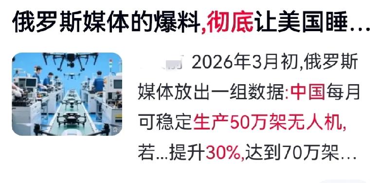 怎么看待俄媒披露中方"无人"机月产50万架,要从多维度关注认知? 月产50万架!战时再扩30%!中国无人机实力,让美方彻底破防! 俄媒曝光中国无人机产能数据,瞬间震动西方军事圈!现代战争早已不是天价武器的炫技场,而是工业产能与供应链的终极对决。 美方深陷高端军备误区,造武器如造奢侈品,造价高昂、产能极低,产业链更是严重空心化,战时根本扛不住消耗。反观俄乌战场,低成本无人机以小博大,几百美元装备瘫痪数百万美元装甲,谁能量产、谁能补损,谁才掌握主动权。 中国拥有全球最完整无人机全产业链,全环节自主可控,月产50万架仅为常规产能,战时民企转产即可轻松扩容30%。海量无人机蜂群,直接打破霸权威慑幻想。 我们不惹事,但绝不怕事!大国工业底气,就是最硬的和平盾牌! 对此,你怎么看? 中国军工 无人机产能 大国底气