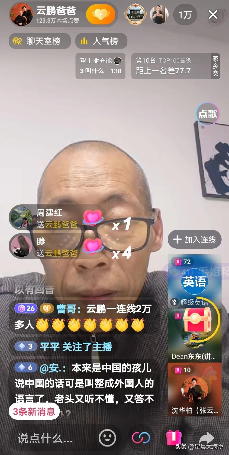 不知道为什么大家这么喜欢张云鹏呢? 刚刚看到云鹏的爸爸在开播, 直播间里云鹏的爸爸连线超级学英语,之后还连线云鹏, 超级英语一边给大家翻译,一边教两边学英语,学汉文, 可笑的一幕是张云鹏一上线突然直播就20000人在观看, 但是不知道什么原因云鹏那边信号不好卡断了,之后一下子直播又是10000人了。 可见那10000人都是奔着看云鹏来的[捂脸]