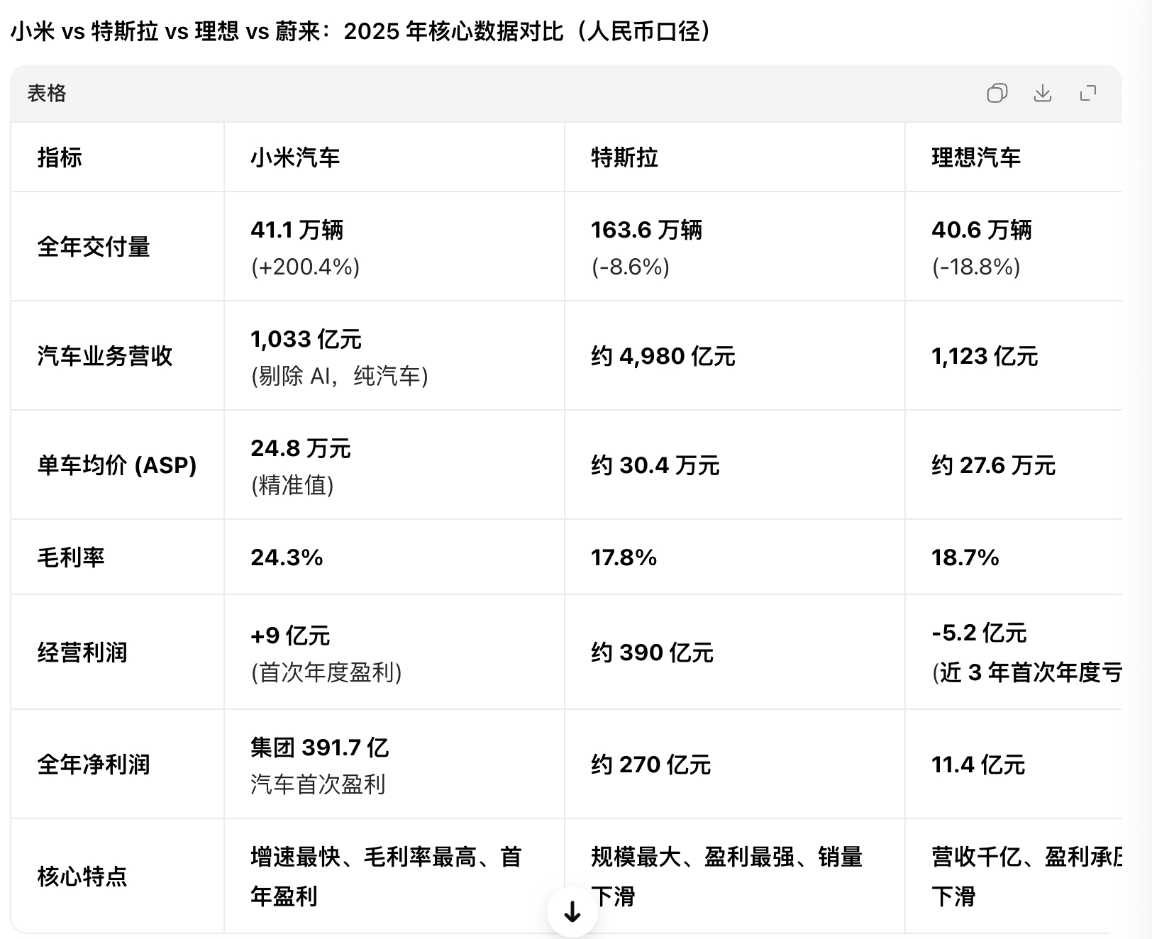 小米2025年净利润391.7亿 小米汽车业务收入首超千亿小米 vs 特斯拉 vs 理想 vs 蔚来:2025 年核心数据对比发现小米汽车确实是最强黑马——增速最快、盈利最强、毛利率最高的新势力纯汽车业务收入为 1,033 亿元,AI 及其他创新业务约 28 亿元单车均价:1,033 亿 ÷ 41.1 万 ≈ 24.8 万元。