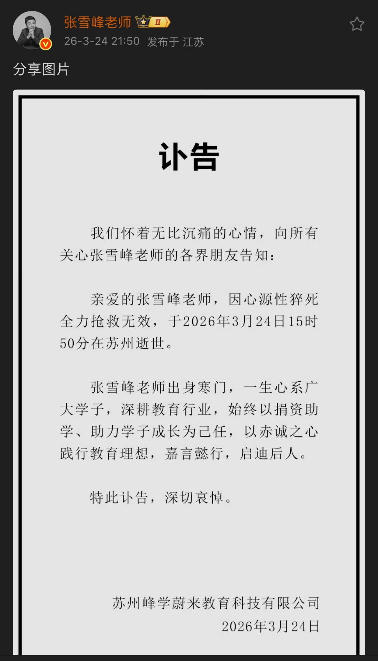 张雪峰公司发布讣告张雪峰去世张雪峰账号发布讣告:因心源性猝死全力抢救无效,于2026年3月24日15时50分在苏州逝世。年纪轻轻太可惜了,一路走好…