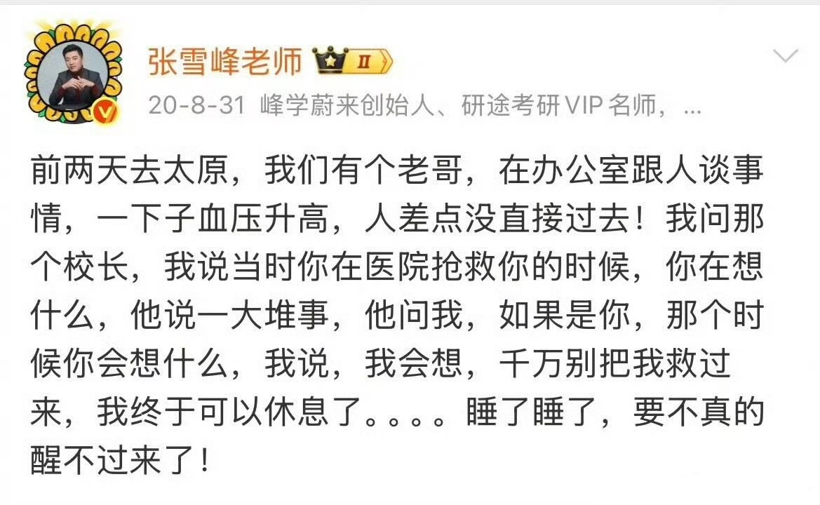 还是不相信这是真的,希望是假的,前几天看到一个视频,张雪峰连麦到一个家长,孩子成绩很好,但孩子的爸爸已经患癌,家长一直瞒着孩子,当时张雪峰已经眼含泪光,最后做了一个决定,这个孩子的大学费用他包了,当时我都看哭了!为什么好人的结局都……张雪峰账号头像变成黑白张雪峰头像