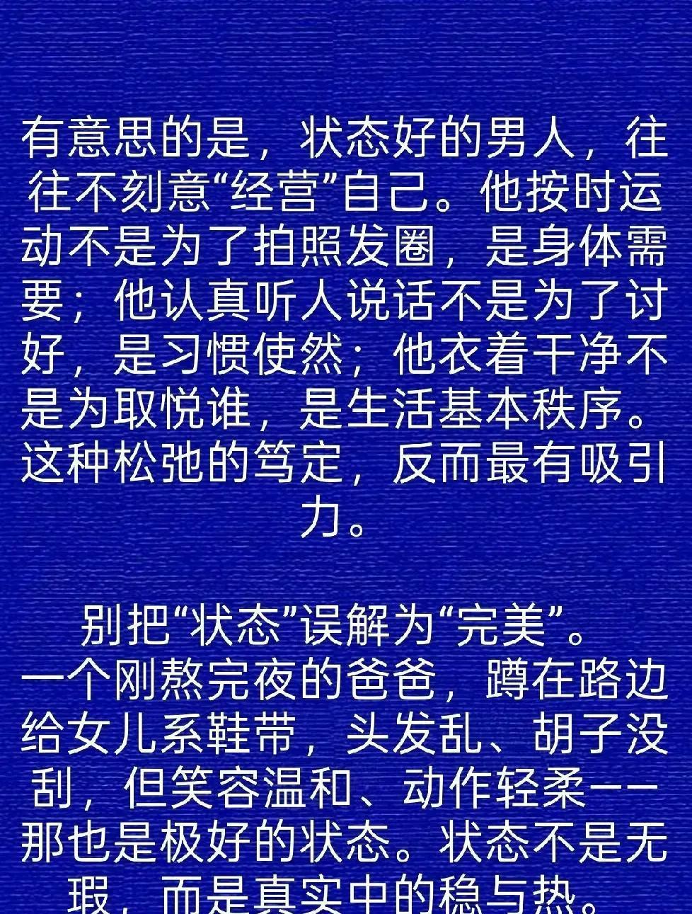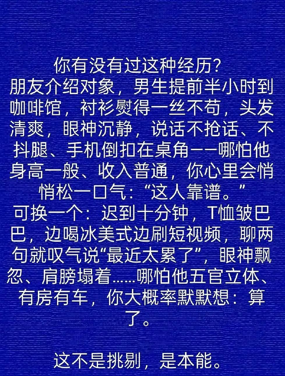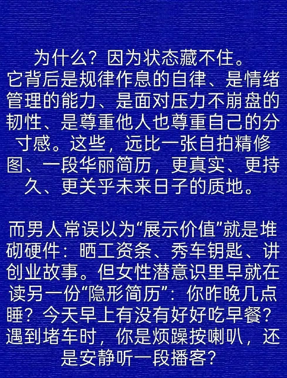 2025年上海高端婚介数据显示,女性择偶中情绪价值占比已超四成,远高于传统物质条件。 过去纠结“她到底喜欢我哪一点”,如今答案越来越清晰:不是脸,不是钱包,而是每天的状态。 一个男人再帅再有钱,如果每天焦虑颓丧、眼神躲闪、说话带刺,女生一眼就能看穿。这种状态像无声的标签,直接盖章“这个人不行”。 反过来,收入普通但眼神清亮、说话稳当、遇到事不慌不乱的男生,反而容易被记住。2025年青年婚恋报告显示,性格、三观、情绪稳定已成为择偶前三,经济条件退居其后。 为什么状态这么致命?因为它骗不了人。脸可以P,身材可以练,但一个人内心的松紧、面对压力的从容度,是日常相处里藏不住的。女生不是在选“完美对象”,而是在选“能一起过日子的人”。 状态好的男生,通常意味着情绪稳定、自我管理强、能给关系提供安全感。这种安全感,比 momentary 的浪漫更持久,也比银行卡数字更可靠。 近两年多份调查反复印证:女性越来越倾向“宁缺毋滥”,她们愿意等一个状态在线、能让彼此都更清醒、更从容的伴侣,而不是将就一个外在光鲜却内在疲惫的对象。 最终决定关系的,往往不是有多惊艳,而是每天的状态有没有在悄悄拉近距离。状态,就是最诚实的发言人