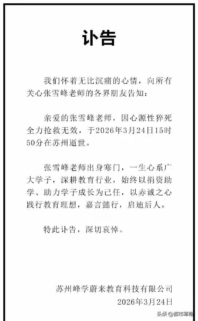 才41岁,那个在九三阅兵后表示,若统一台湾战争打响,个人捐5000万,公司捐一亿,成名后捐资助学不辍的张雪峰去世了。心源性猝死抢救无效。 个人觉得,在高考志愿填报这方面,张雪峰给学子们提供了不少好的建议。虽然因为说话比较直,难免多少有些言论不妥,也得罪了一些人。 张雪峰的英年早逝,除了让人惋惜之外,也让人感受到生命的脆弱。死亡面前,人人平等。也提醒我们每一个人,珍惜当下,珍惜眼前人,保重身体。财富无尽,生命有限。每个人在创造财富的同时,不能以损害健康为代价。